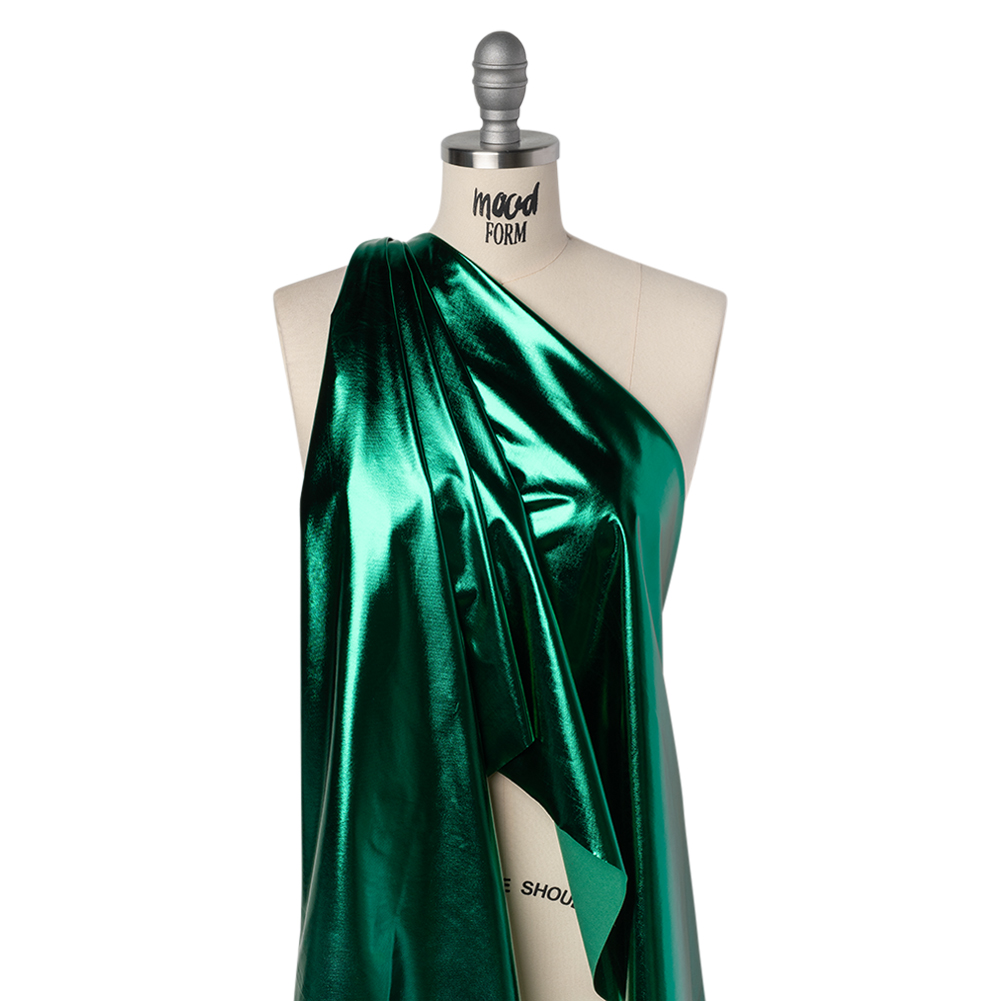 You don’t need to adorn yourself with jewels when you’ve got this Emerald Metallic Foiled Polyester Jersey Knit. With a sleek hand, flexible drape, and slight stretch, it’s the perfect day—and night—companion.Suggested Projects: Dresses, Pants, Skirts, TopsContent: 100% PolyesterStretch: 25% Weftwise, 15% WarpwiseOpacity: OpaqueThe metallic emerald green foil glitters across the solid rich green backdrop of this polyester jersey knit, catching the light with every move for a dazzling, high-shine effect. With its sleek hand, flexible drape, and 25% stretch through the weft (plus a touch in the warp), this fabric is designed to make a statement. Ideal for standout creations, it transforms effortlessly into bodycon dresses, matching mini skirts and crop tops, or flared pants paired with a sleek athletic jacket for bold, all-day—and night—style. Fully opaque, it requires no lining—keeping your projects lightweight and ready to move.