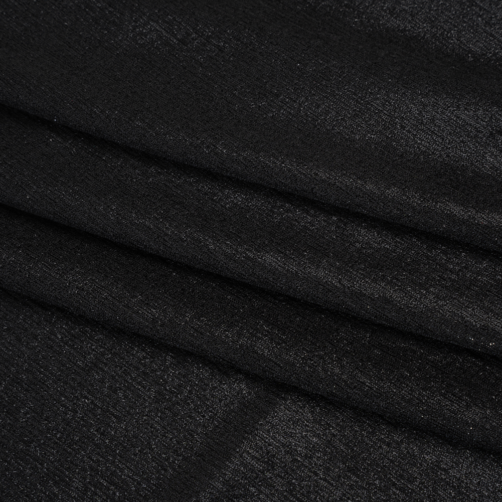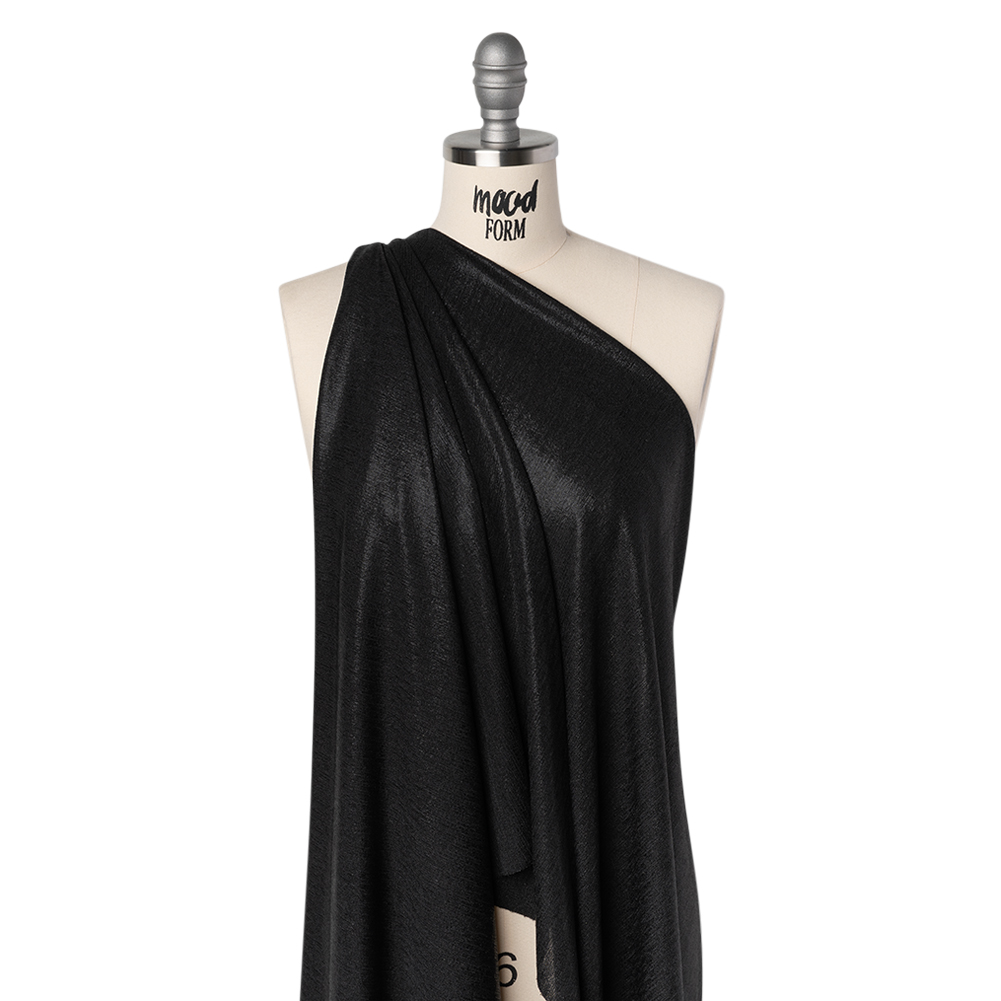 Bring some fun and flair to your gothic aesthetic with this Black on Black Metallic Foiled Uneven Stretch Rib Knit. With a sleek hand, fluid drape, and moderate stretch, it’s ready to follow wherever the day—and night—takes you.Suggested Projects: Dresses, Cardigans, Pants, TopsContent: 95% Polyester, 5% SpandexStretch: 75% Weftwise, 25% WarpwiseOpacity: Slightly TranslucentA metallic black foil glitters in bold contrast against the solid black backdrop of this rib knit, catching the light with every movement for a striking, high-shine finish. With a sleek hand, fluid drape, and 75% stretch through the weft (plus a touch through the warp), this fabric is made to shine—literally. Perfect for creating paparazzi-worthy looks, try it in bodycon dresses for nights out, matching maxi skirts and tube tops for the dance floor, or fit-and-flare pants paired with a breezy cardigan for bold daytime style. Slightly translucent, we recommend layering over camis or slips for extra coverage.