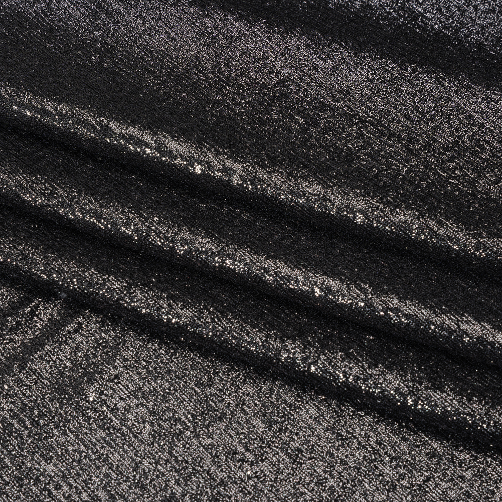 Light up the night with this Charcoal on Black Metallic Foiled Uneven Stretch Rib Knit. With a sleek hand, fluid drape, and moderate stretch, it’s ready to follow wherever the day—and night—takes you.Suggested Projects: Dresses, Cardigans, Pants, TopsContent: 95% Polyester, 5% SpandexStretch: 75% Weftwise, 25% WarpwiseOpacity: Slightly TranslucentA metallic charcoal foil glitters in bold contrast against the solid black backdrop of this rib knit, catching the light with every movement for a striking, high-shine finish. With a sleek hand, fluid drape, and 75% stretch through the weft (plus a touch through the warp), this fabric is made to shine—literally. Perfect for creating paparazzi-worthy looks, try it in bodycon dresses for nights out, matching maxi skirts and tube tops for the dance floor, or fit-and-flare pants paired with a breezy cardigan for bold daytime style. Slightly translucent, we recommend layering over camis or slips for extra coverage.