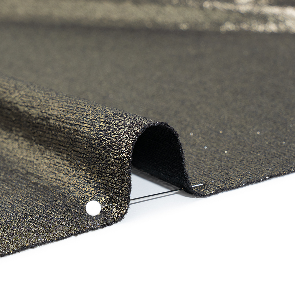 Elegance meets ease of wear within this Light Gold on Black Metallic Foiled Uneven Stretch Rib Knit. With a sleek hand, fluid drape, and moderate stretch, it’s ready to follow wherever the day—and night—takes you.Suggested Projects: Dresses, Cardigans, Pants, TopsContent: 95% Polyester, 5% SpandexStretch: 75% Weftwise, 25% WarpwiseOpacity: Slightly TranslucentA metallic light gold foil glitters in bold contrast against the solid black backdrop of this rib knit, catching the light with every movement for a striking, high-shine finish. With a sleek hand, fluid drape, and 75% stretch through the weft (plus a touch through the warp), this fabric is made to shine—literally. Perfect for creating paparazzi-worthy looks, try it in bodycon dresses for nights out, matching maxi skirts and tube tops for the dance floor, or fit-and-flare pants paired with a breezy cardigan for bold daytime style. Slightly translucent, we recommend layering over camis or slips for extra coverage.