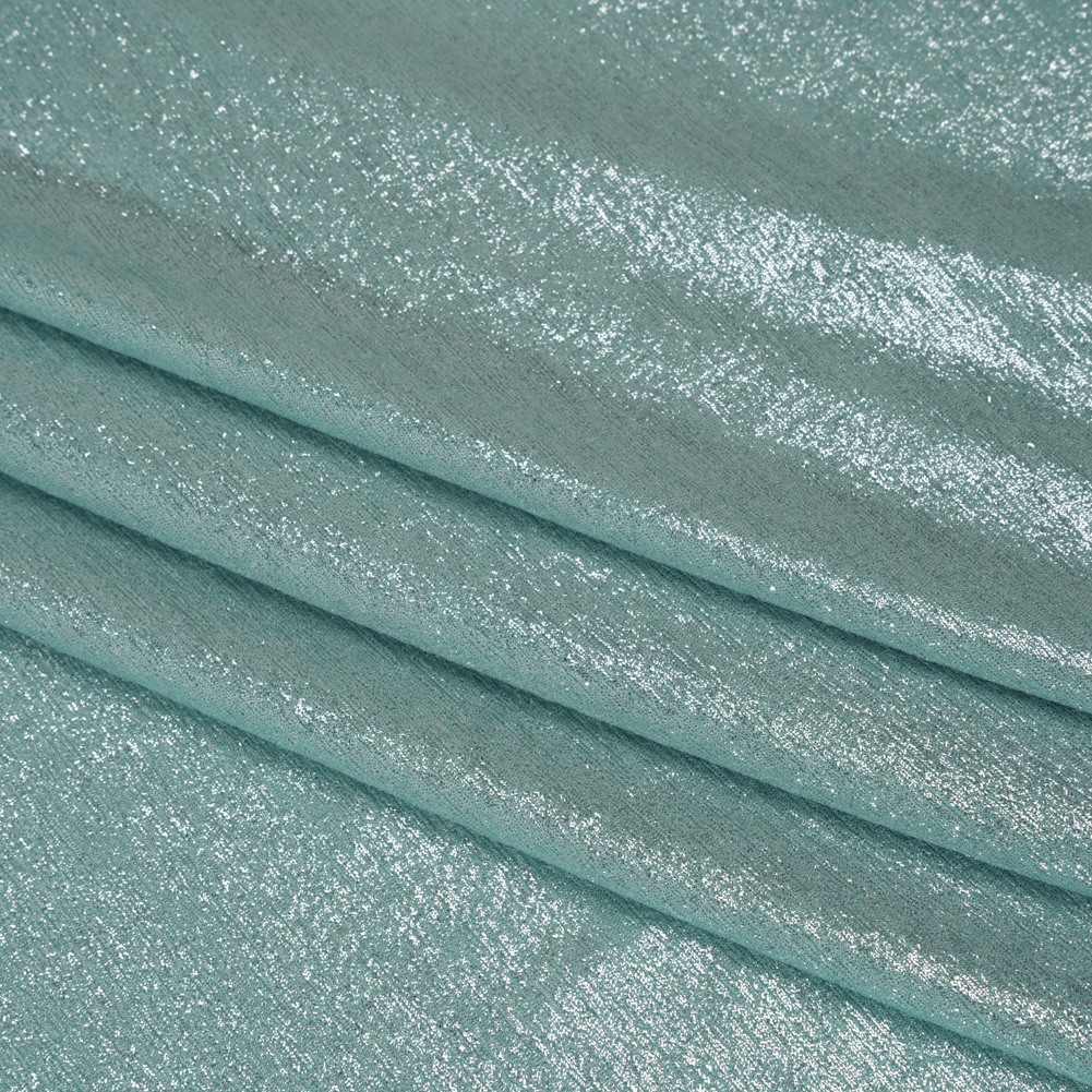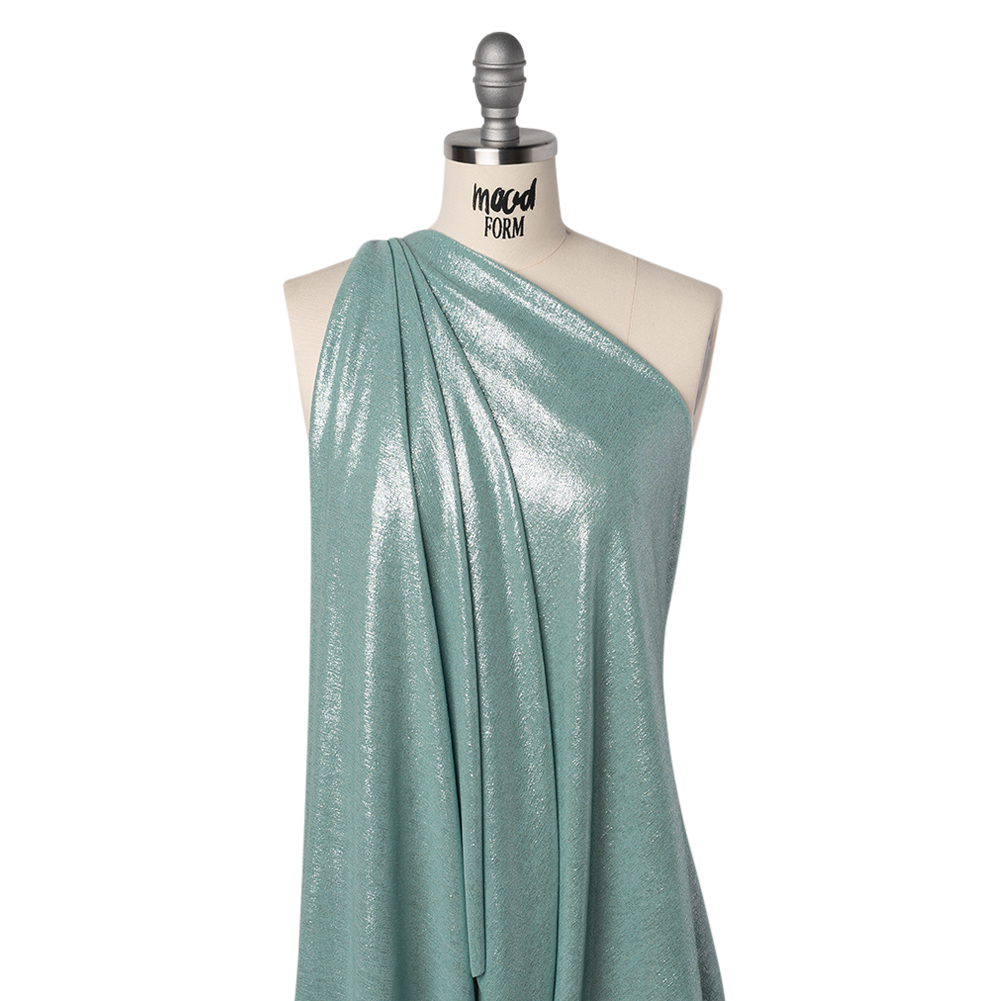 You were mint to find this Silver on Mint Metallic Foiled Uneven Stretch Rib Knit. With a sleek hand, fluid drape, and moderate stretch, it’s ready to follow wherever the day—and night—takes you.Suggested Projects: Dresses, Cardigans, Pants, TopsContent: 95% Polyester, 5% SpandexStretch: 75% Weftwise, 25% WarpwiseOpacity: Slightly TranslucentA metallic silver foil glitters in bold contrast against the solid mint green backdrop of this rib knit, catching the light with every movement for a striking, high-shine finish. With a sleek hand, fluid drape, and 75% stretch through the weft (plus a touch through the warp), this fabric is made to shine—literally. Perfect for creating paparazzi-worthy looks, try it in bodycon dresses for nights out, matching maxi skirts and tube tops for the dance floor, or fit-and-flare pants paired with a breezy cardigan for bold daytime style. Slightly translucent, we recommend layering over camis or slips for extra coverage.