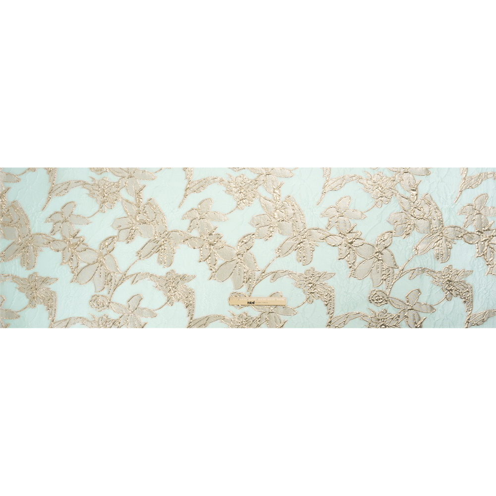 May starshine and pixie dust lead you to our magical Metallic Gold and Aqua Floating Flowers Luxury Burnout Brocade. Embossed flowers rise in the background and foreground of this luxurious fabric; the more opaque petals outlined in metallic gold grab your attention first while their discrete counterparts hide in the sheer aqua backdrop. The face is three-dimensional and grainy, falling with a semi-structured drape—perfect as an elegant overlay for a gown or skirt. If complete opacity is desired, we suggest adding a silk habotai lining (for an added boost of luxury, too!).