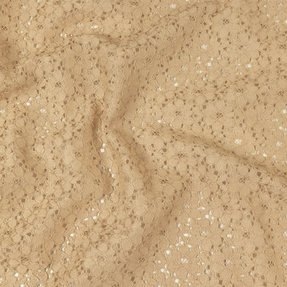 Who doesn't love a little lace? This Metallic Gold and Beige Floral Corded Lace is sure to find a place in your heart! On a beige lace ground, sparkling gold cords outline each individual flower, combining refinement and glamor with ease. Pliable in drape with a tactile hand, try constructing lingerie, peak-a-poo sleeves and collars, or perhaps daring cutout details on dresses and jumpsuits. Due to the open weave, a lining may be desired to increase opacity but isn't strictly necessary.