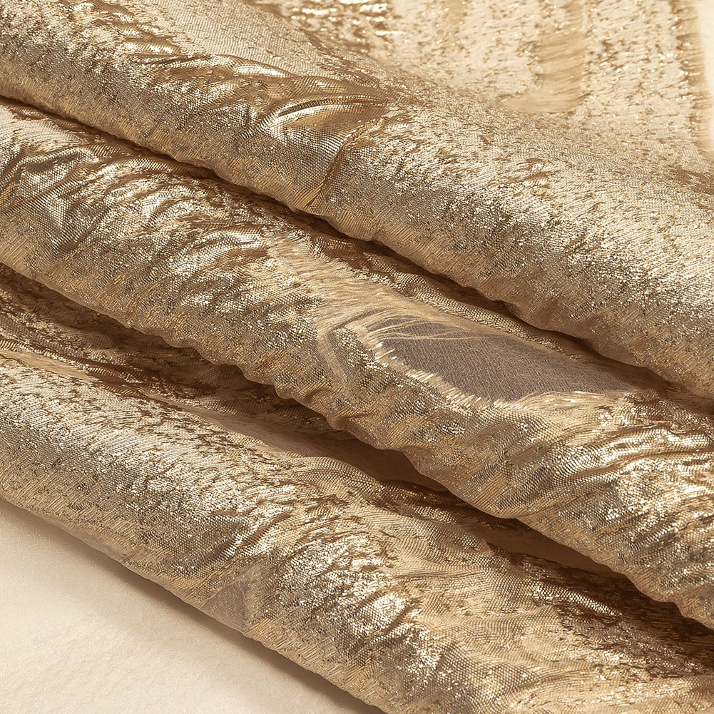 Got glitter in your veins? Celebrate your love for all things sparkly with our Metallic Gold and Beige Marbled Veins Luxury Burnout Brocade! Packed with plenty of shine, one large abstracted flower, woven in beige and gold, is burned out of a sheer, sparkly beige ground resulting in an oversized opalescent panel. Slightly coarse in hand due to the metallic fibers, with a puckered, pebbly texture thanks to the brocade weave, this lightweight, crisp brocade is ideal for statement dusters, ball gown overlays, or full skirts. Due to the sheer ground, a lining is suggested for anyone looking for extra modesty and a smooth, finished feel.Please note: Each individual panel measures 60 by 62 inches.