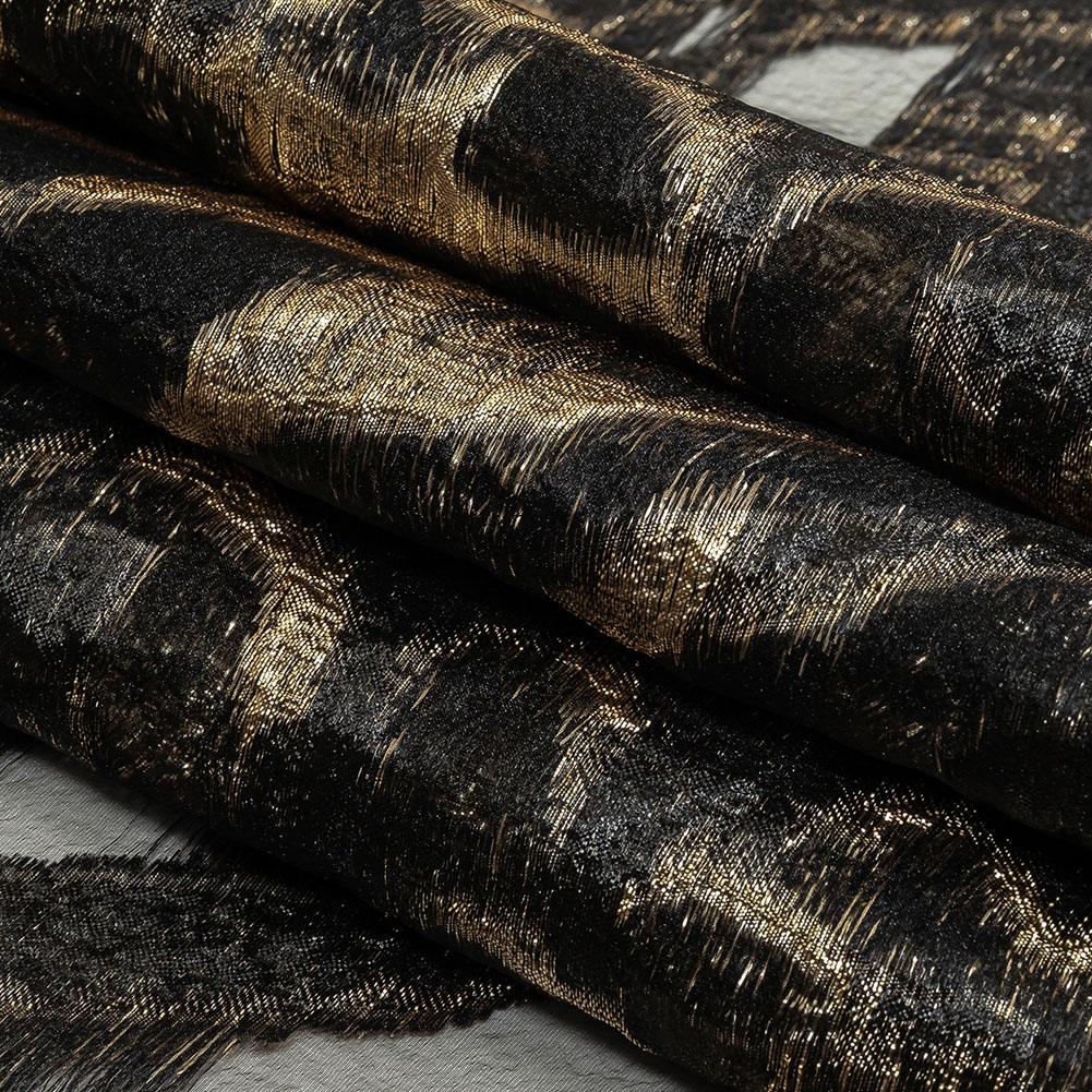 Like veins of gold in a dark mine, the sight of this Metallic Gold and Black Abstract Luxury Burnout Brocade will leave you feeling richer than ever before.