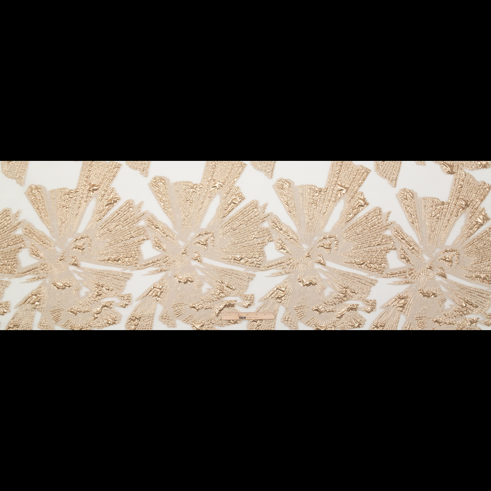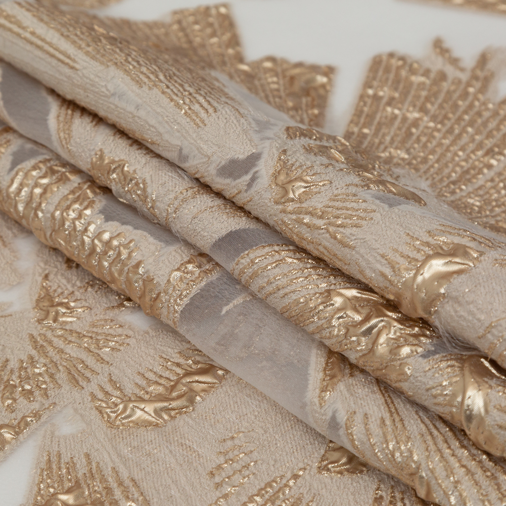 Shining as bright as a copper-kissed sun, our Metallic Gold and Ecru Large-Scale Burnout Floral Luxury Brocade gifts warmth all year round! Oh-so-dreamy, inspiration slips in naturally. To be caught up in its lavish facing and crisp hand, a tactile experience proves inevitable: Long petals, flattened into highlights and shadows, show as bright, bulbous forms juxtaposed with patches of muted, fibrous yarns. Channeling stratus clouds sprinkled with metallic, these forms ripple and wave in concentrated areas of the composition. Characteristic of devore (burnout), the sheer moments are windows of opportunities; here, presenting a crinkled face with a shimmering complexion, one can see through to the linty loose ends on its reverse face as they cast halos around the floral motifs. And, teeming with varying degrees of luster, Lurex® threads slide through the organza backdrop in a horizontal fashion. Overall boasting a stiff body, this medium is well equipped for silhouettes of few seams that do not rely on drape. Best for formal occasions: Sew up some ball gowns or hula-hoop skirts; go all out in overzealous, bulbous ensembles; nominate it for overlay applications; and more. Mainly translucent and of a light-to-medium weight, incorporating a lining fabric will grant true opacity as well as help to avoid slippage at the seams.