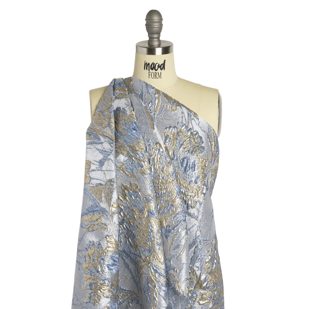 Feeling blue now has a beautiful ring to it thanks to this Metallic Gold, Blue and Gray Radiant Roses Luxury Brocade. Blue, gold, and gray flowers spread their metallic petals against a crackled, lustrous background. The weave raises the flowers and cracks, bringing a spongy feeling to the sleek and grainy face. Surprisingly supple, this luxurious fabric dreams of voluminous ball gowns, jackets, bodices, and more. Slightly translucent; a silk habotai lining can be added for increased comfort and luxury.