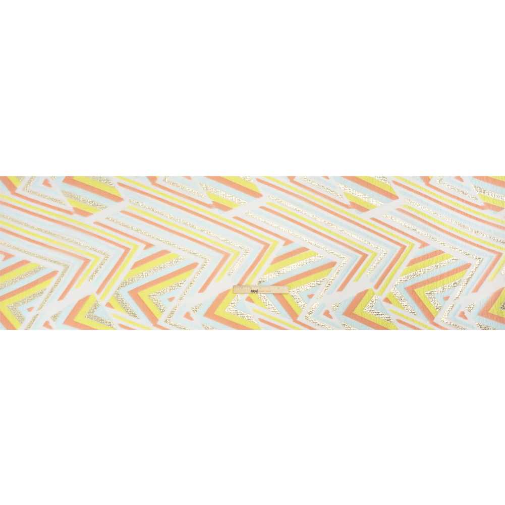 Dance the night away in this fun Metallic Gold, Coral and Lime Chevrons and Arrows Luxury Burnout Brocade! A lime green, coral, and gold chevron pattern decorates a sheer background as glimpses of thicker stripes are shown through rectangular windows for a fun variation in pattern. The colored lines are wrinkled, bringing dimension to the pebbly face. Lightweight and malleable, use this fabric as an overlay or pair it with a silk habotai lining to create ball gowns, voluminous circle skirts, and more.