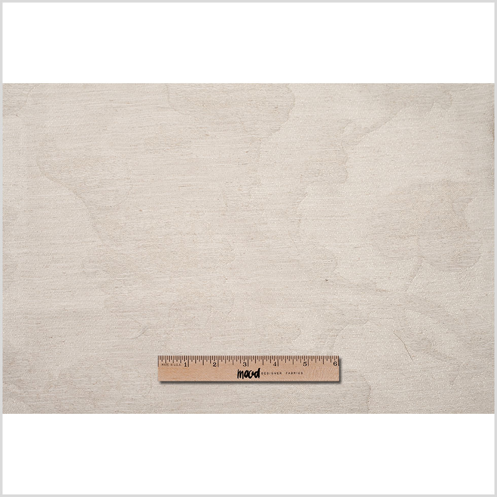 Obtain a hint of class with this floral fabric! Waving horizontal threads in white and linen are layered by glistening metallic gold flowers which illuminate the surface of this smashing polyester. Both soothing and elegant, this fabric is essential for that up-scale look. Achieve an understated high-class appearance by using this fabric for drapery, accent pillows, and other interior decorations. Note that this material is of a lighter weight, contains a soft, yet textural surface, and is completely opaque.