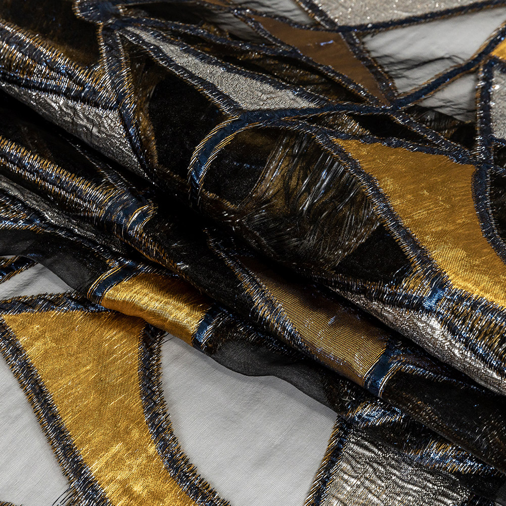 A vault of gleaming metals by unlocked in this Metallic Gold, Neon Navy and Ice Flow Geometric Burnout Luxury Brocade. Raised navy blue bands divide polygons of sheer black, glittering silver and softly shimmering gold like stained glass; the colors complemented by varying textures: Crisp, rough, and silky—in turn. With a full drape, concoct cavernous capes, substantial skirts, or exuberant gowns with contrasting underlayers for maximum color. Add a lining for opacity or to play with color through the sheer patches, or forego linings to play with transparency.