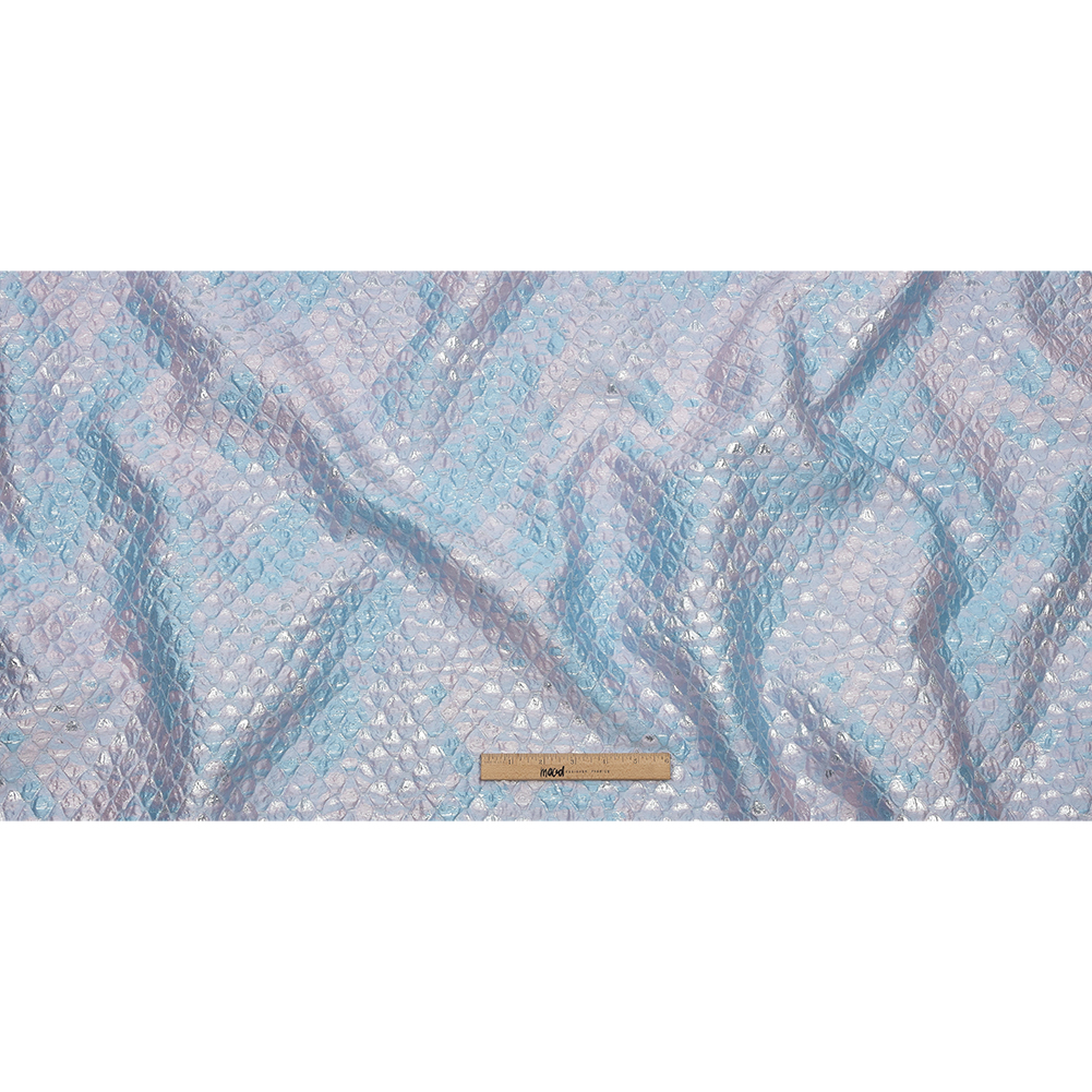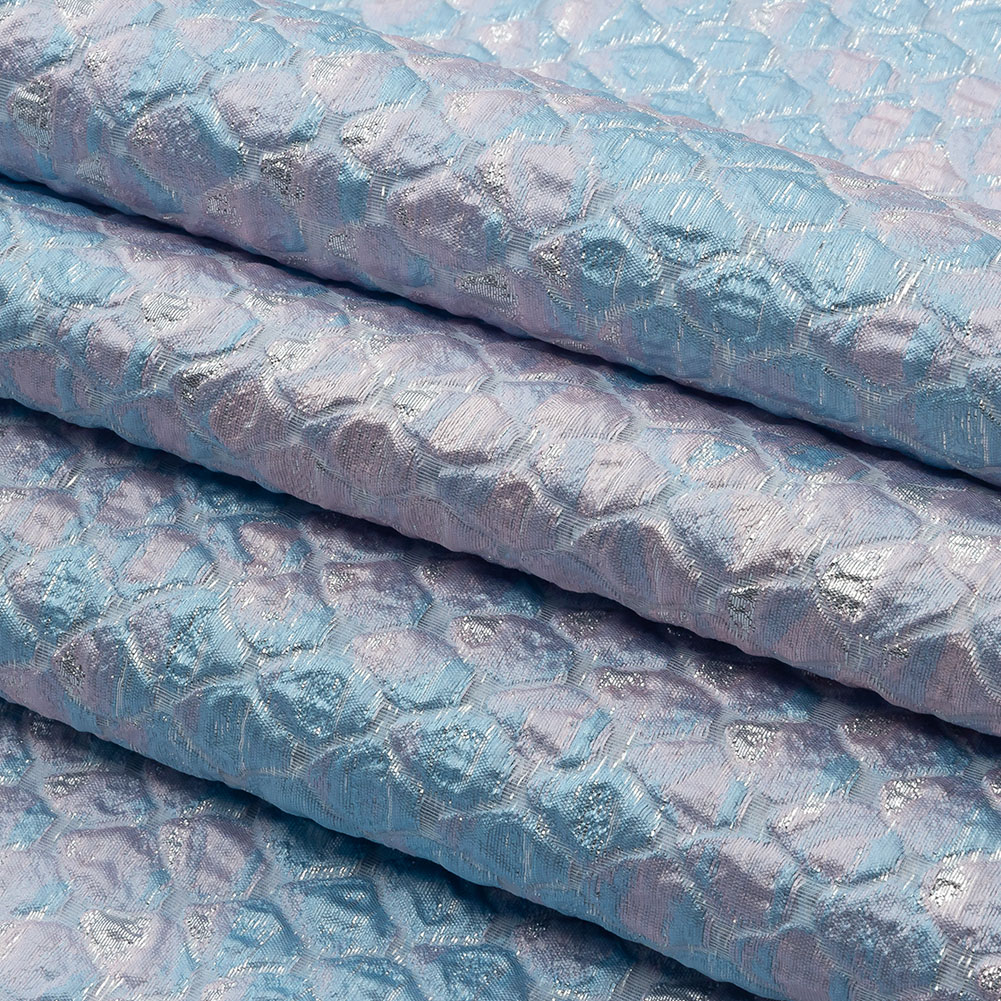 You'll feel like you're in a Barbie movie when you wear this dazzling Metallic Gold, Pink, and Pale Blue Abstracted Scales Luxury Brocade. An abstracted scale-like design plays with a deliciously bubbly texture and sweet color palette of baby blue and pale pink, accented with metallic silver. Use the voluminous, flexible drape to create boxy coats with fur collars, bell-skirted gowns, regal capes, and so much more! While opaque, a lining may be desired for comfort.