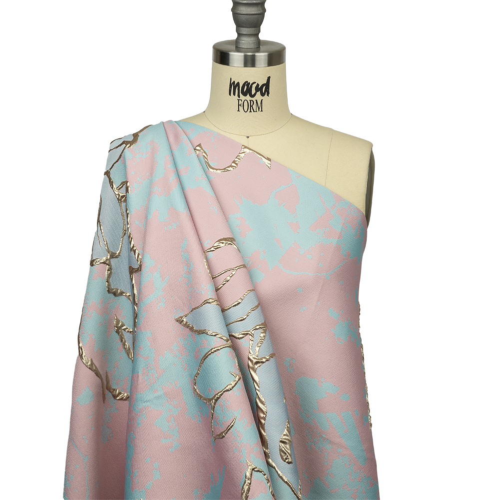Inspired by Rococo aesthetics, fans of Regencycore will love Mood's Metallic Gold, Pink and Sky Blue Mottled Floral Outlines Luxury Brocade! A mottled background of pastel pink, lavender, and sky blue shades is interrupted by raised, metallic pale gold floral outlines. Soft in hand with the occasional coarse, raised texture, the drape is pliable and structural, perfect for daring eveningwear. We picture dramatic ballgowns, cocktail dresses, and jumpsuits, or even trousers and bomber jackets to add an upscale touch to your everyday wardrobe. Opaque, a lining may be desired to protect finished products from fraying at the seams but is not strictly required.