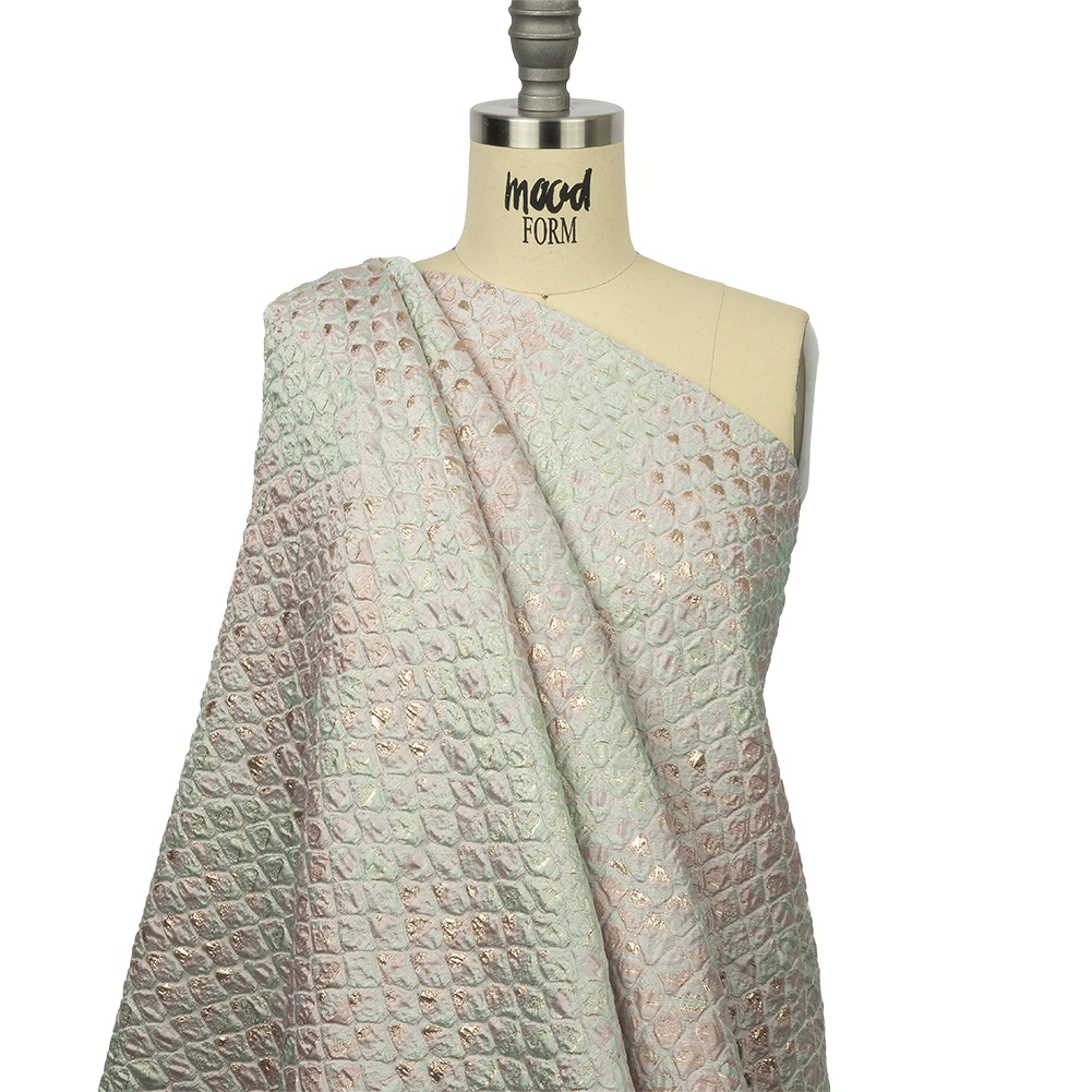 Parade into a pastel paradise with this Metallic Gold, Seafoam Blue and Light Pink Abstracted Scales Luxury Brocade. An abstracted scale-like design plays with a deliciously bubbly texture and sweet color palette of pale seafoam and baby pink, accented with metallic gold. Use the voluminous, flexible drape to create boxy coats with fur collars, bell-skirted gowns, regal capes, and so much more! While opaque, a lining may be desired for comfort.