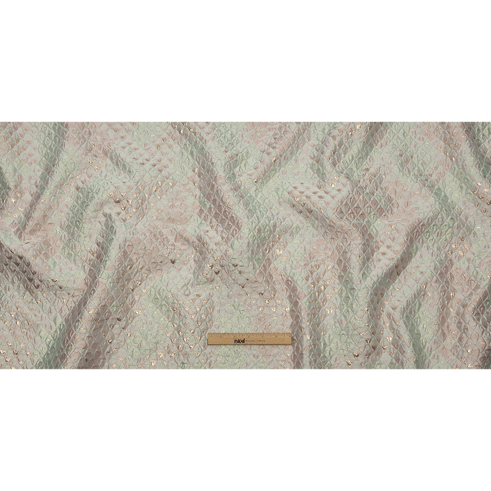 Parade into a pastel paradise with this Metallic Gold, Seafoam Blue and Light Pink Abstracted Scales Luxury Brocade.