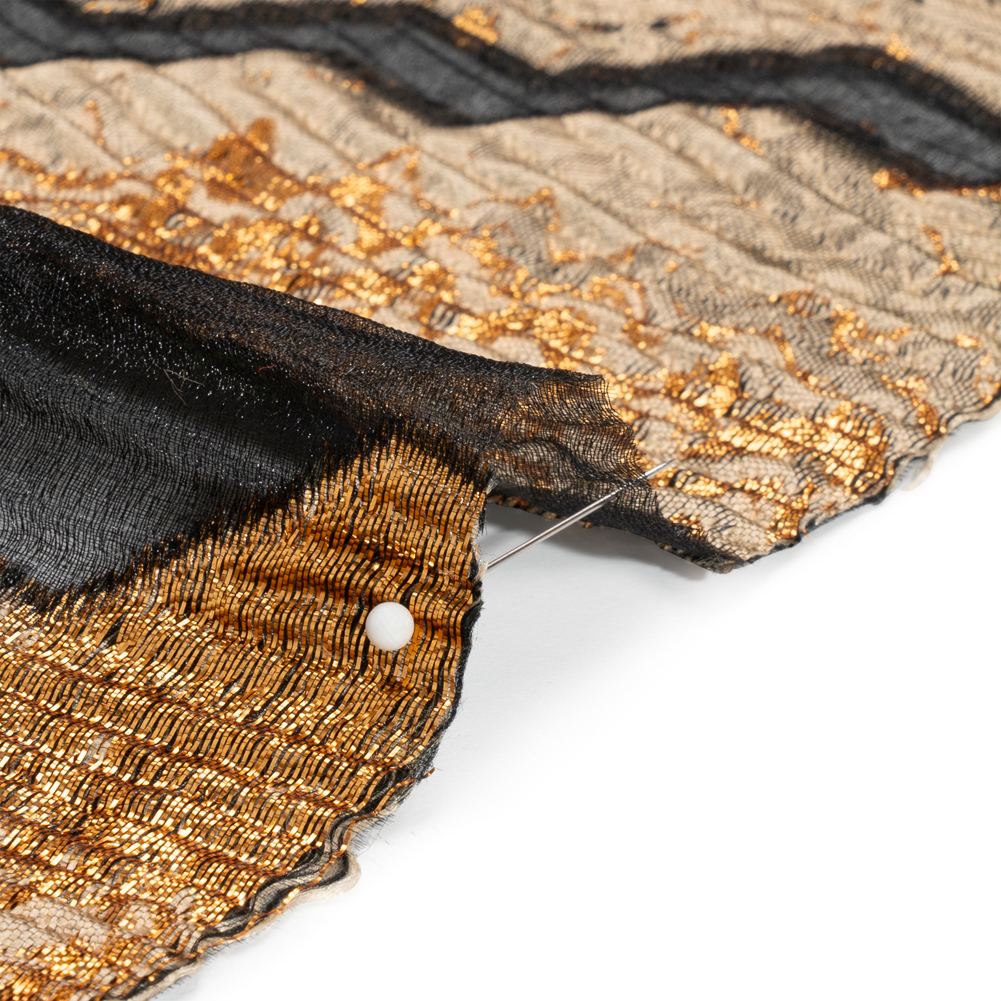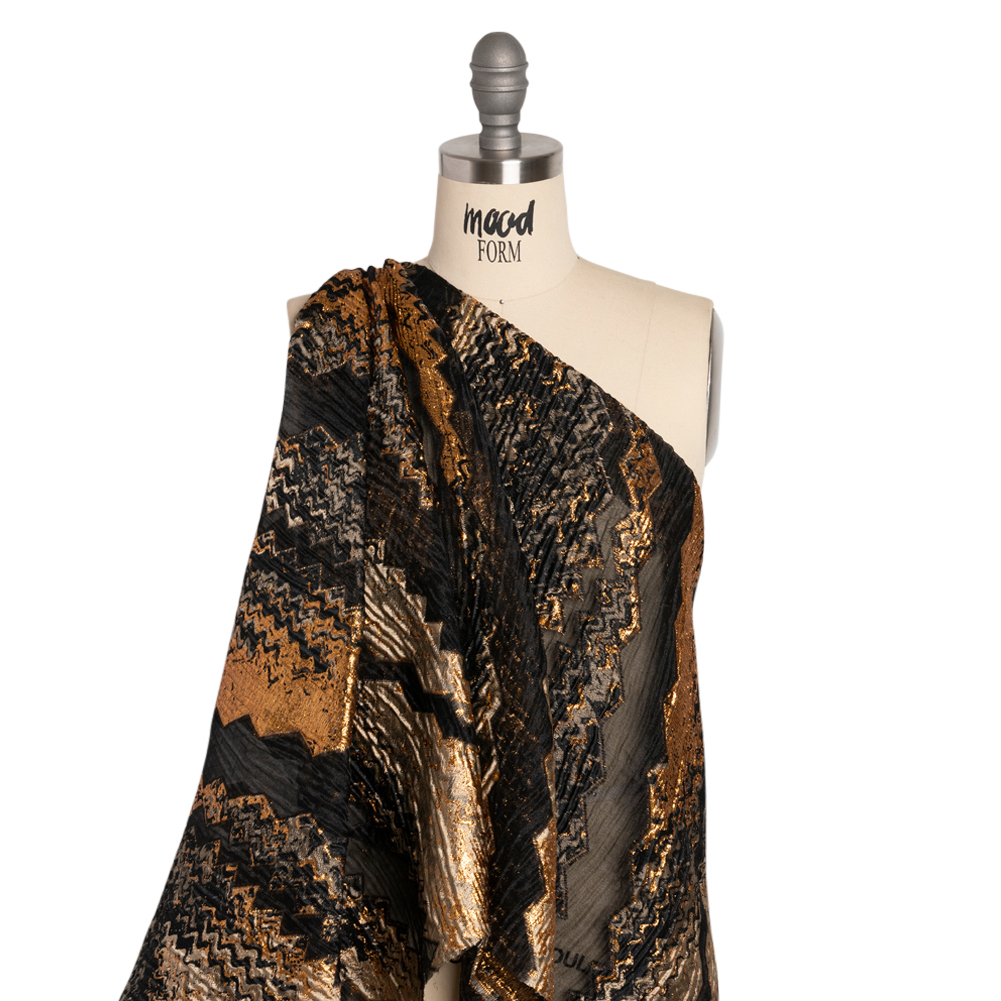 Cloak yourself in this luxurious Metallic Gold, Taupe and Black Drifting Rifts Crinkled Luxury Burnout Brocade! Sheer black zig-zags, caused by a burnout finishing technique, cause jagged rifts between molten taupe, black, and metallic gold sections. The complex weave creates thick, horizontal ribs in the face, yielding a tactile yet slick hand—it is this embossed face that elevates brocades above other fabrics. Semi-structured yet voluminous, the drape lends itself wonderfully to stunning ball gowns and circle skirts. You may also find yourself dreaming up sheath dresses, structured jackets, and more! For extra luxury, we suggest lining this fabric with our silk habotai.