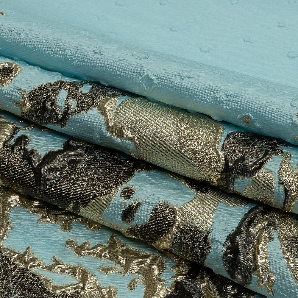 Metallic Golden Mist, Black and Sky Blue Spotted and Splattered Luxury Brocade
