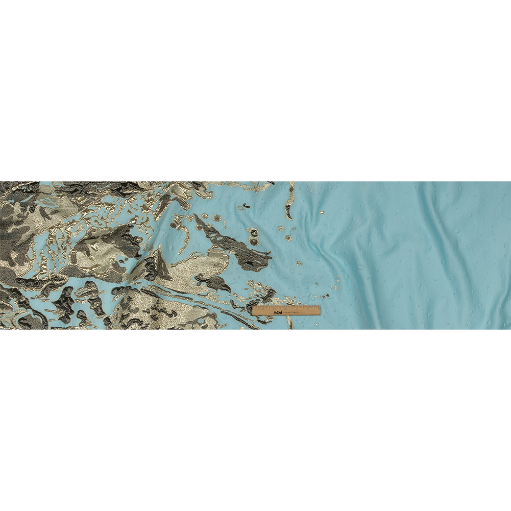 Be entranced by this Metallic Golden Mist, Black and Sky Blue Spotted and Splattered Luxury Brocade! Containing a crisp, smooth hand without stretch, a sky blue background is splattered with gold and black and dotted with dimensional tonal spots throughout.