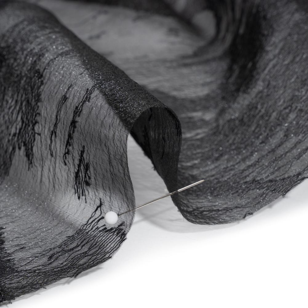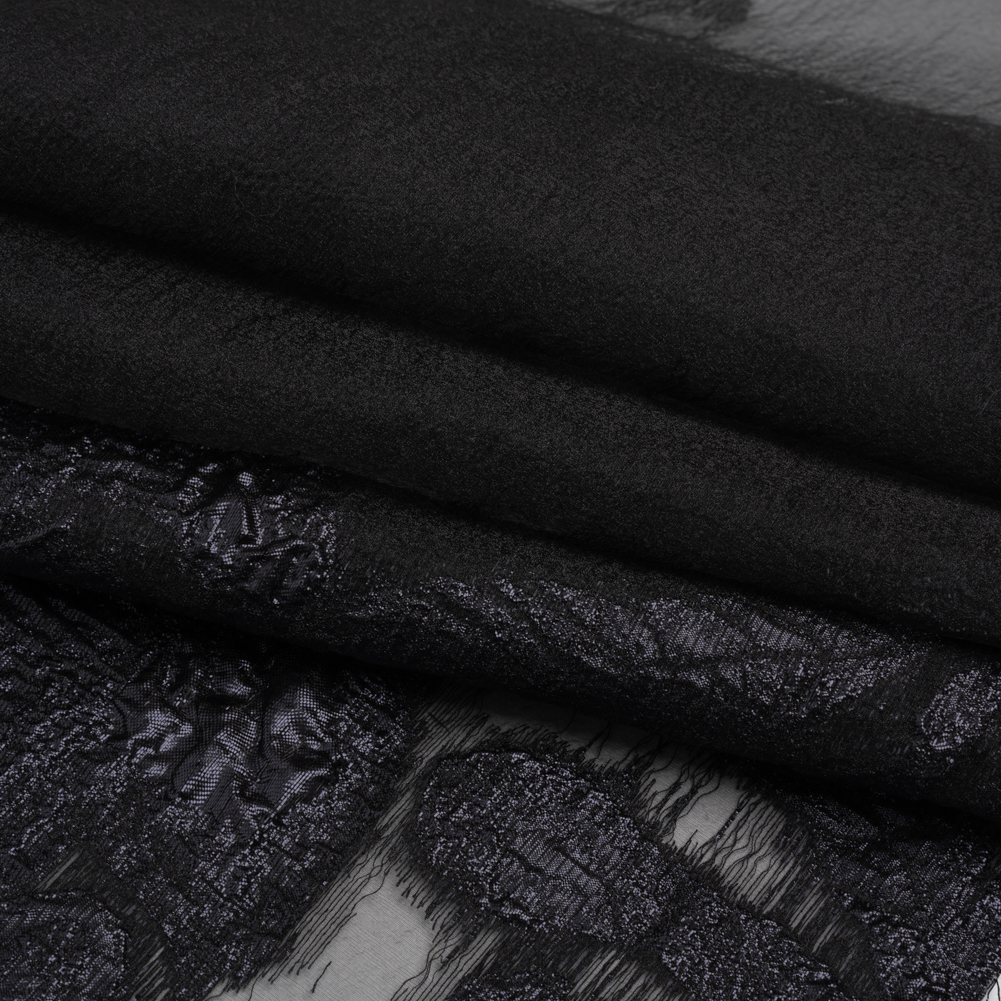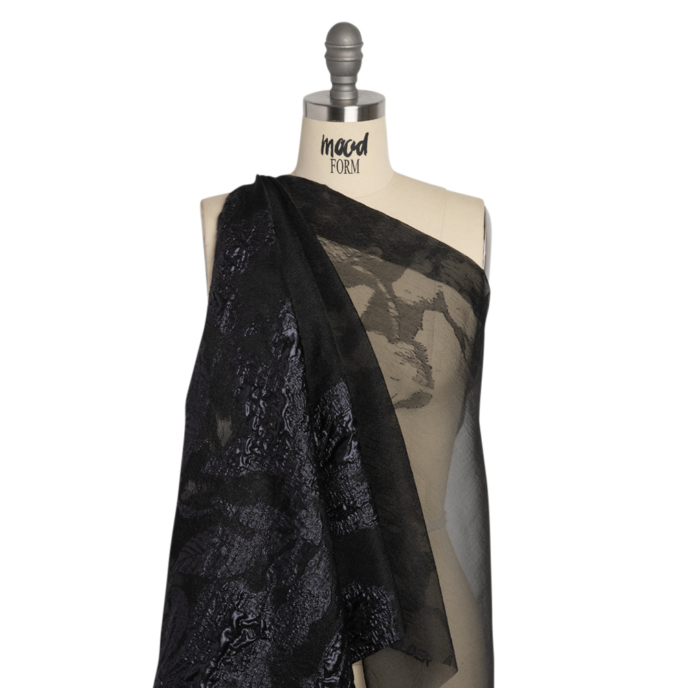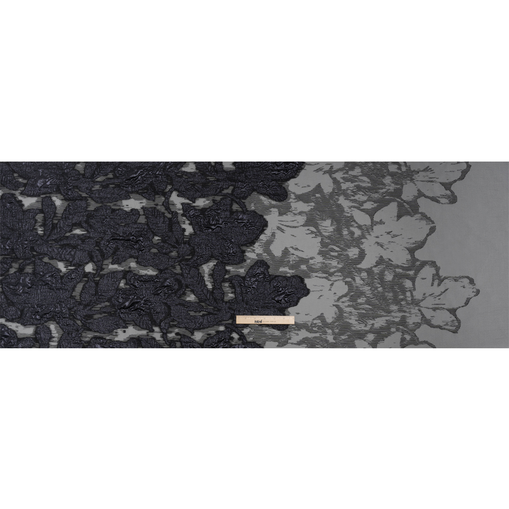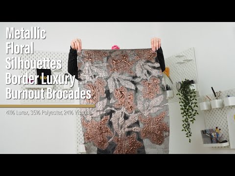 You'll want every occasion to be a special occasion with this Metallic Gunmetal and Black Floral Silhouettes Border Luxury Burnout Brocade. A dense garden of metallic black flowers slowly disperses across a sheer black background, growing flowers that bubble with a three-dimensional and grainy texture. Fairly lightweight and with a supple drape, this lustrous fabric is perfect with or without a lining, depending on your intended project. Brocade: a textured fabric created by a complex weave. Burnout: a chemical treatment that turns areas of the fabric sheer. Together? A fabric for the runway—think camera flashes and oohs and ahhs. Iconic looks begin with bold textures, and this fabric knows a thing or two about visual appeal. From ball gowns to jackets, luxury burnout brocades help you take that first step out of your comfort zone and into a world of style.