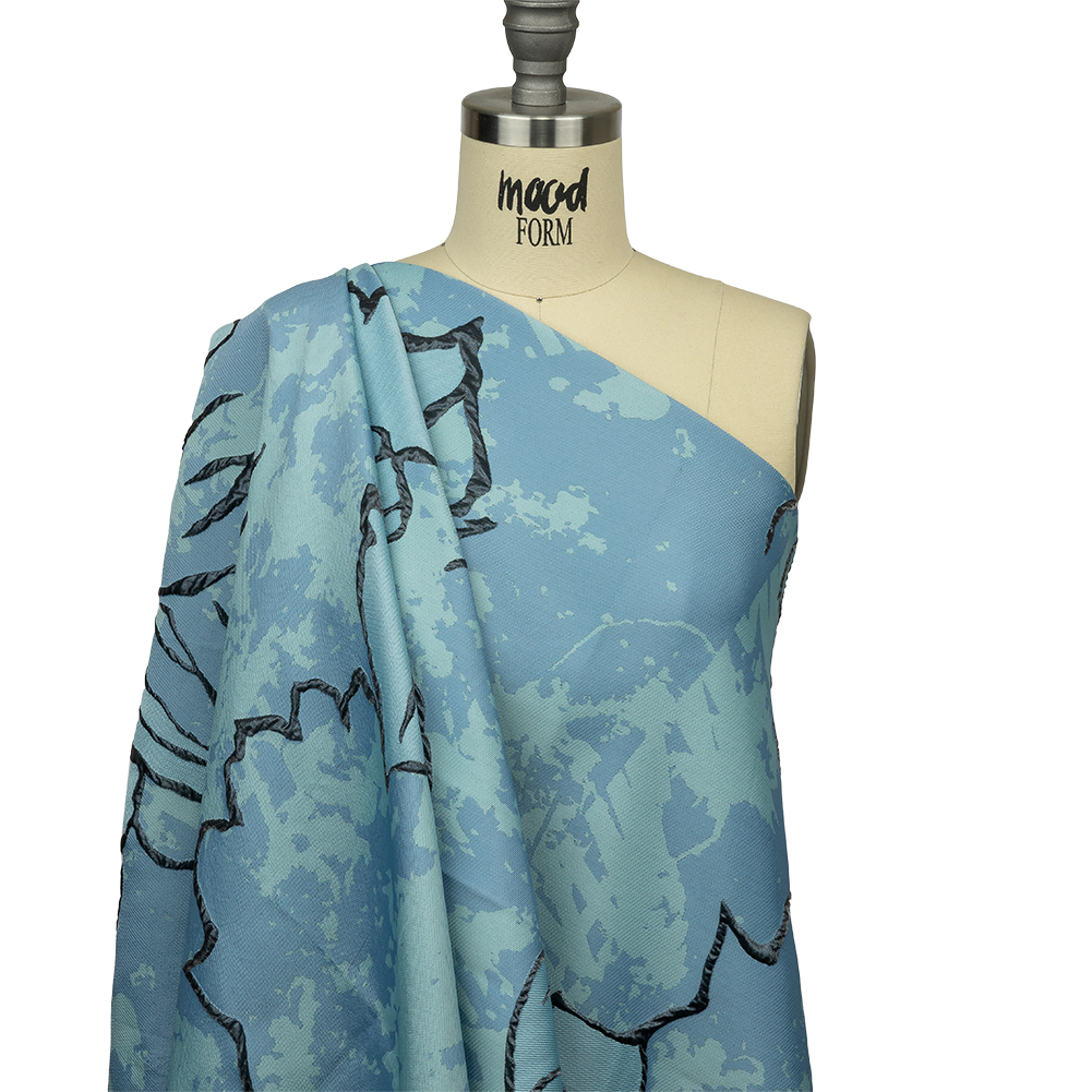 Fusing serene blue with edgy gray metallics, Mood's Metallic Gunmetal and Blue Mottled Floral Outlines Luxury Brocade is a rock star's dream! A mottled background of light blue shades is interrupted by raised, metallic gunmetal gray floral outlines. Soft in hand with the occasional coarse, raised texture, the drape is pliable and structural, perfect for daring eveningwear. We picture dramatic ballgowns, cocktail dresses, and jumpsuits, or even trousers and bomber jackets to add an upscale touch to your everyday wardrobe. Opaque, a lining may be desired to protect finished products from fraying at the seams but is not strictly required.