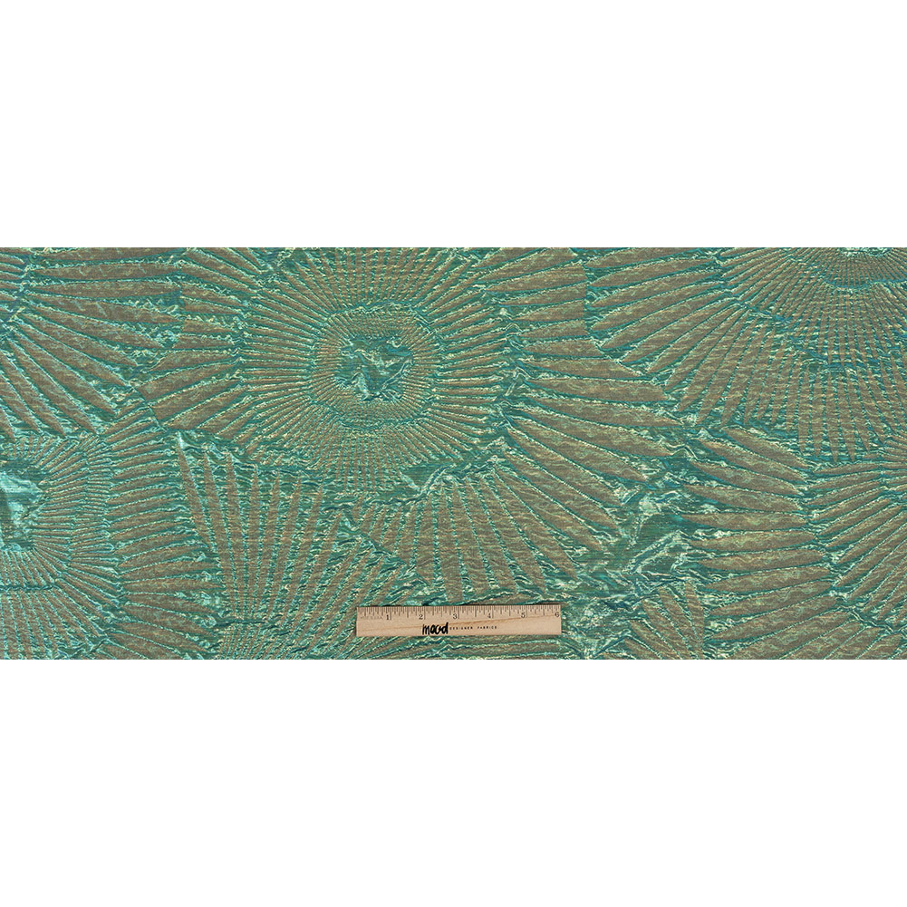 Play with the colors and sparkle of beetle-wings with this Metallic Iridescent Turquoise, Yellow and Pink Abstract Luxury Brocade, adding a splash of historical luxury to your work. Petal-like rays of pinkish-orange burst through pools of iridescent teal, while the colors swap places on the other side of this stunningly reversible fabric. Crisp and highly textured with a rough edge resulting from the metallic fibers, find a place for this fabric in fabulous evening wear with simple styles that show off the bold pattern. With a semi-flexible drape, craft opulent ball gowns with full circle skirts and structured bodices. Translucent, consider adding a lining for opacity, comfort and additional structure, or to protect delicate threads from unraveling at the seams.