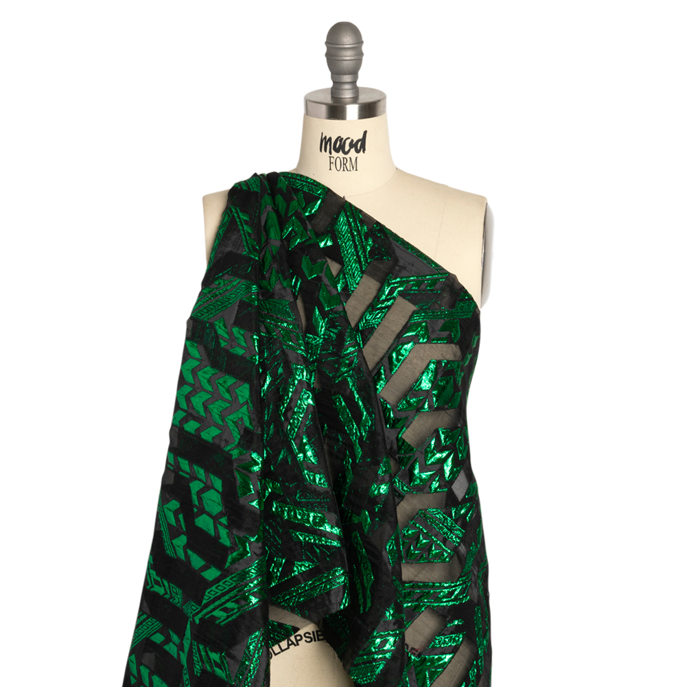 Metallic Kelly Green and Black Geometric Pathways Luxury Burnout Brocade