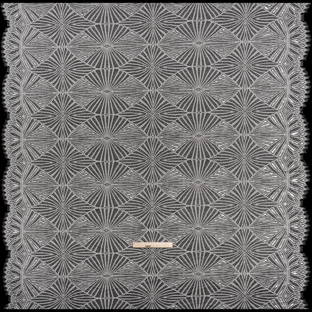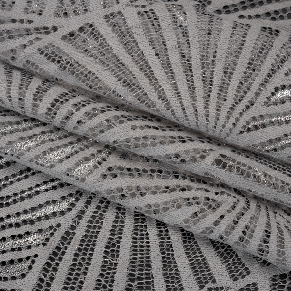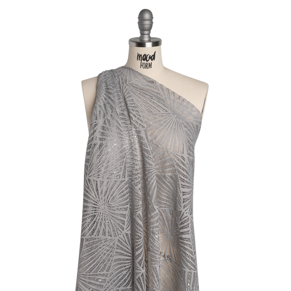 This Silver and Gray Geometric Starburst Metallic Lace Panel with Finished Edges is a constellation captured for couture—featuring a tactile hand and malleable drape.Suggested Projects: Shirts, Skirts, Dresses, OverlaysContent: 80% Nylon, 20% MetallicStretch: NoneOpacity: SheerOgee-inspired geometric starbursts ripple across this gray lace like celestial sigils, each one shimmering with metallic silver threads that catch the light like stardust. With a tactile hand and malleable drape, this fabric bridges the line between delicate and defined—ideal for both graceful, flowing silhouettes and structured eveningwear. Finished edges offer ease for your creative visions, from ethereal maxi skirts and airy button-ups to radiant overlays and gowns. Naturally sheer, it invites layering or a lining to complete the look. Please note: This is a panel that measures 46” by 50”.