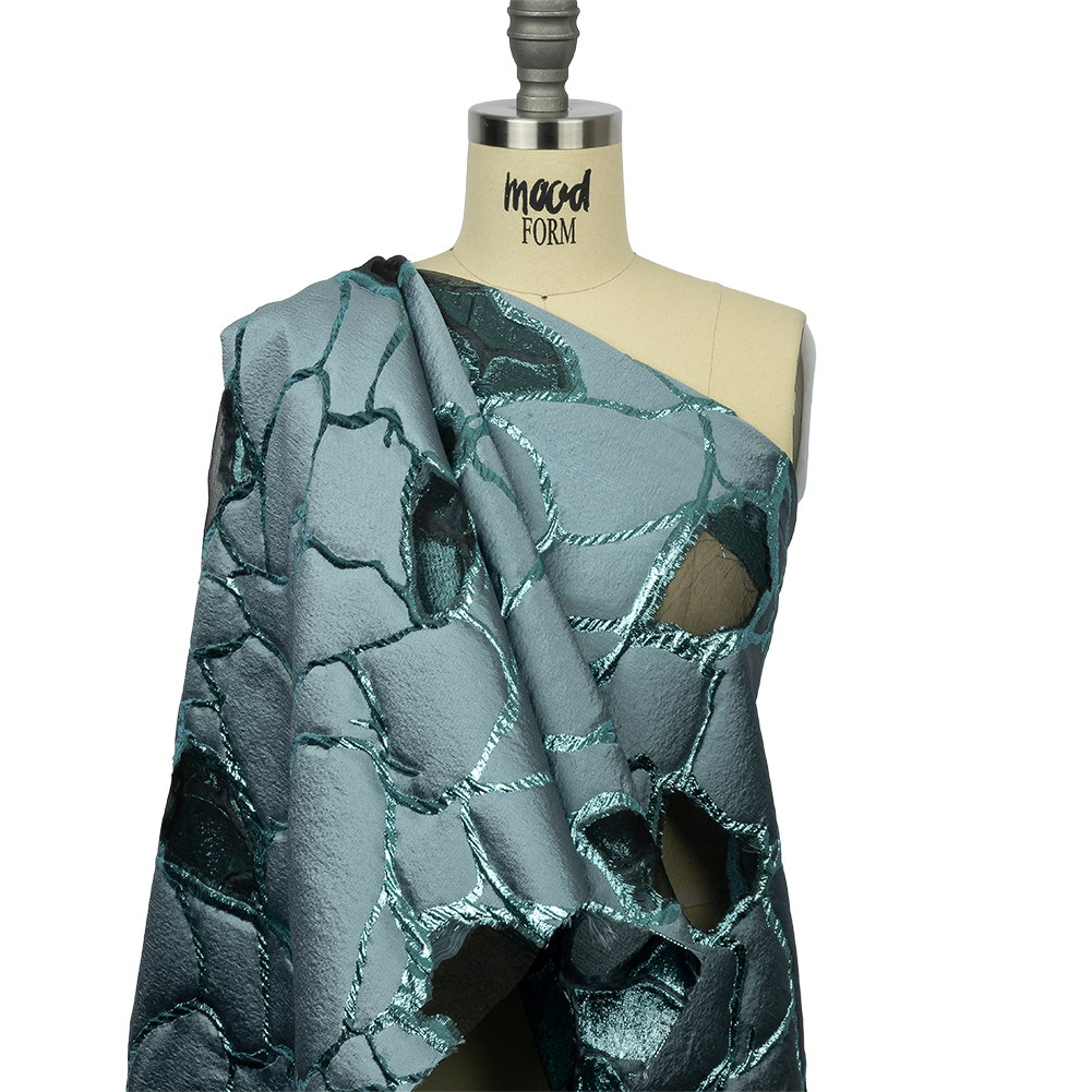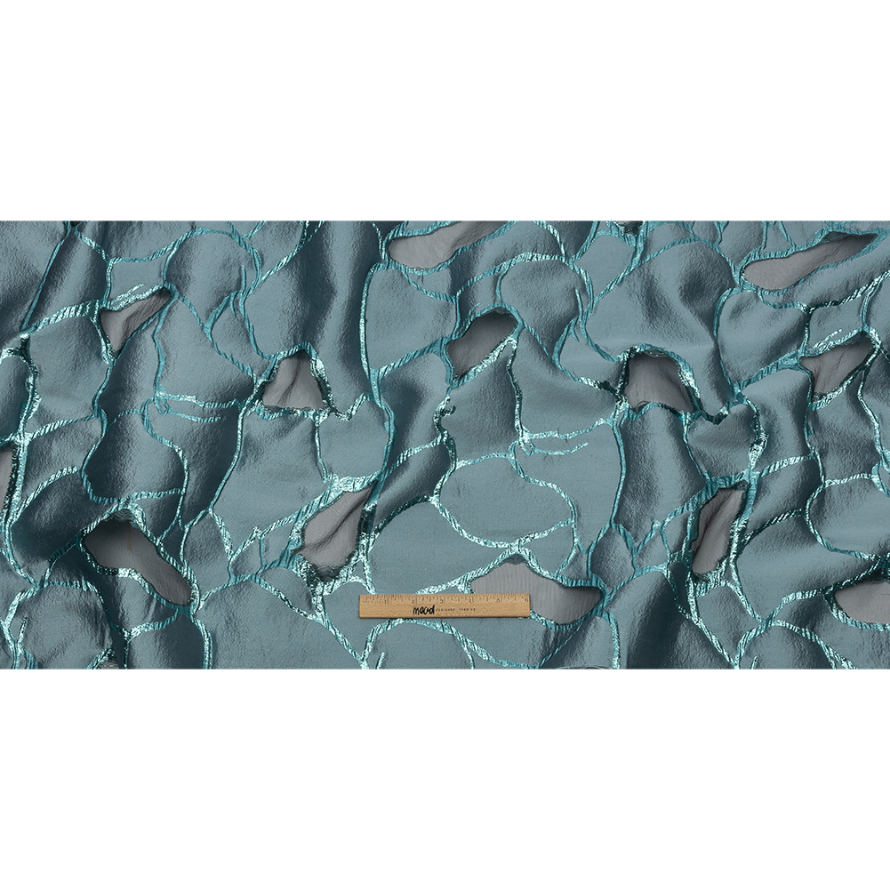 Take on the world in this mesmerizing Metallic Light Blue Abstract Luxury Burnout Brocade. Sections of solid dusty blue are outlined with metallic light blue and accented by sections of sheer organza. Crisp and textural in hand, it features a softly structured, malleable drape that adds delightful versatility. Craft coats with fur collars, gowns, perfectly tailored suit jackets with matching trousers, sarees, shawls, and so much more. Sheer in part, a lining may be added for both opacity and comfort.