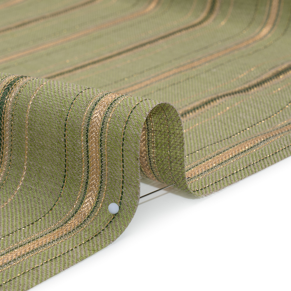 Add some flavor to your officewear with this Railroaded Stripes Metallic Linen Twill—featuring a soft, tactile hand and fluid drape.Suggested Projects: Blazers, Pants, Skirts, DressesContent: Linen, LurexStretch: NoneOpacity: TranslucentMetallic gold and emerald green threads race across this pesto green and beige linen twill, creating a railroaded stripe design. Lightweight and breezy, this linen twill features a soft, tactile hand and fluid drape—perfect for inspiring warm-weather creations. Its simple yet striking metallic stripe design brings effortless elegance to structured blazers, tailored trousers, pinafores, and midi skirts that go from office hours to evenings out. Translucent, we suggest adding a lining for additional opacity and structure.