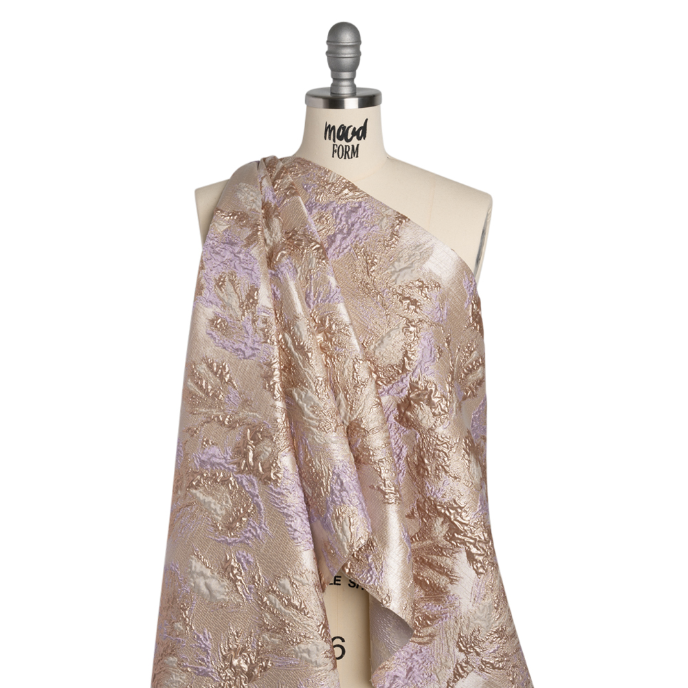 This Baby Pink, Rose Gold and Lavender Abstract Flora Metallic Luxury Brocade takes the cake. With a tactile hand and voluminous drape, use it to create all your fairytale fancies.Suggested Projects: Gowns, Jackets, Skirts, EveningwearContent: 63% Polyester, 25% Rayon, 12% LurexStretch: NoneOpacity: Mostly OpaqueIn metallic shades of baby pink, rose gold, and lavender, an interactive canvas of abstract flora grows atop this luxury brocade. Riveting and rippling, the light reflects off the gleaming top layer, while the back holds the inverse. Chase your happily ever after in evening attire made of this brilliant brocade, in flared gowns, light jackets, and full skirts that complement its voluminous drape. Without stretch and mostly opaque, a lining is recommended for increased comfort and structure.