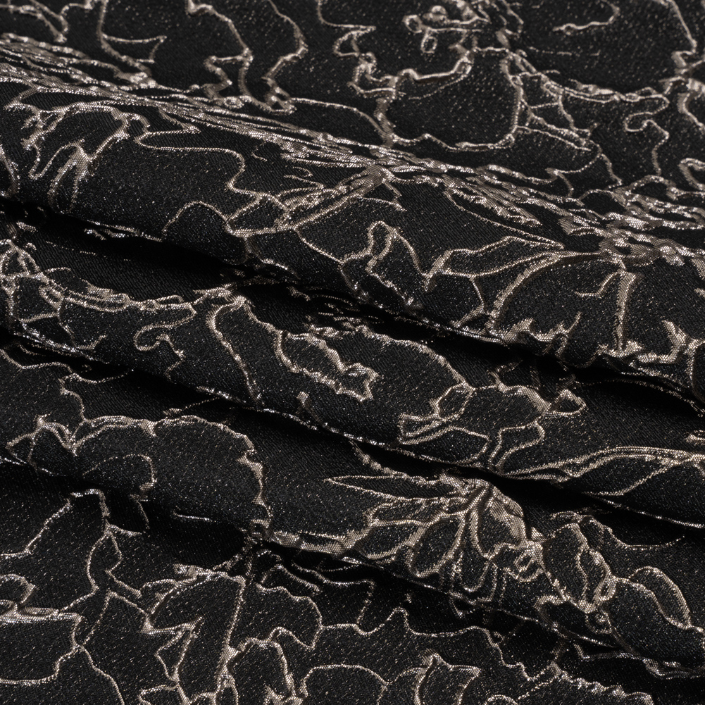 Silver dreams dance across this Black and Silver Floral Outlines Metallic Luxury Brocade. With a tactile hand and semi-structured drape, it’s the ideal choice for stunning eveningwear.Suggested Projects: Gowns, Skirts, JacketsContent: 48% Rayon, 29% Polyester, 23% LurexStretch: NoneOpacity: TranslucentBe the talk of the social season while draped in this luxury brocade. Embossed floral outlines swirl across the otherwise semi-translucent backdrop, creating a three-dimensional, tactile hand and falling in a semi-structured drape. This fabric is perfect for an evening gown or skirt, or for a Met Gala-esque avant-garde look. As this fabric is translucent, we recommend use with a lining, or over camis or slips.