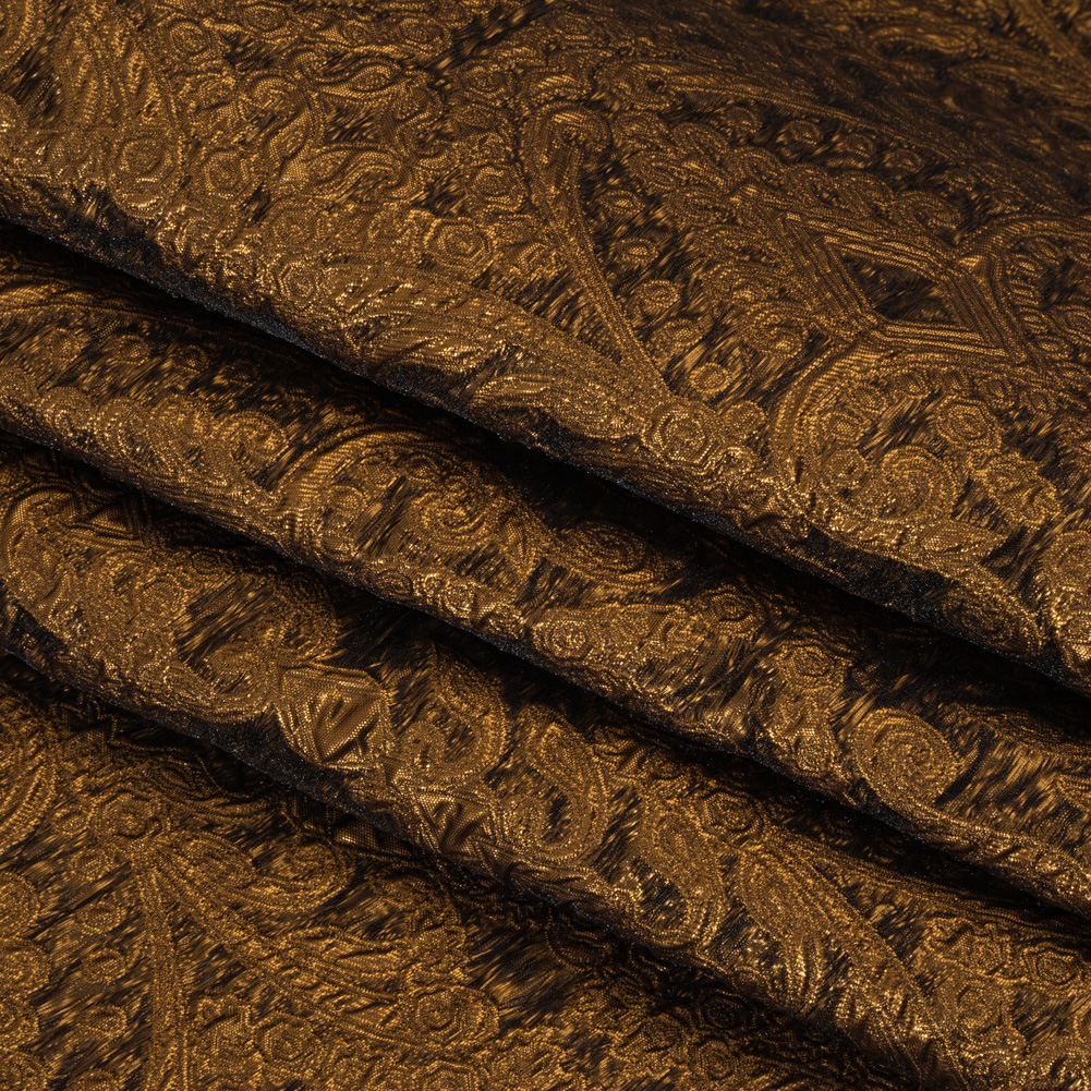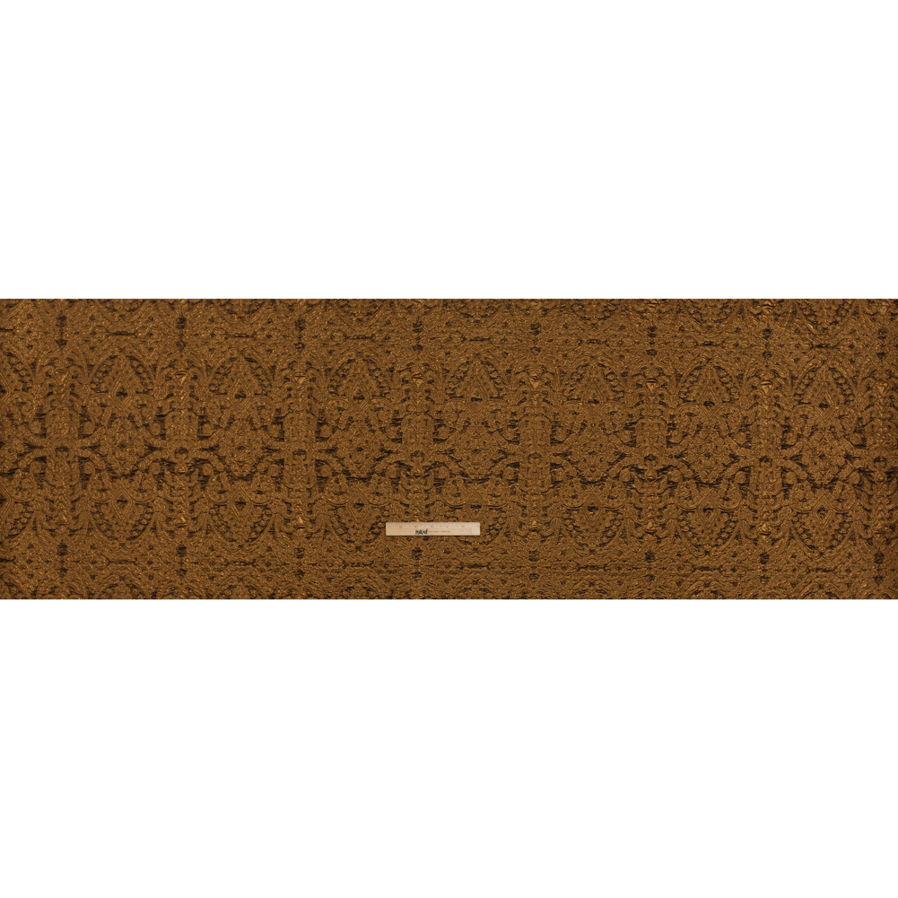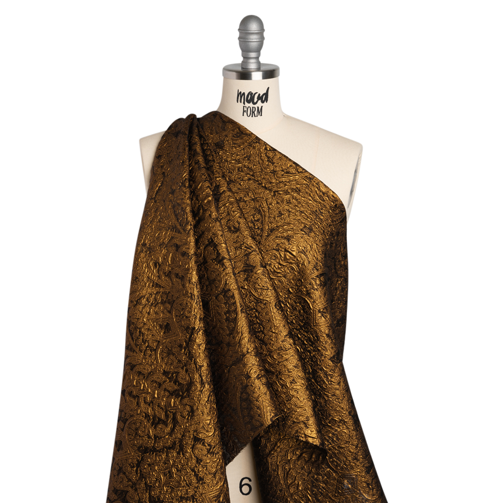 This Copper Fancy Chandeliers Metallic Luxury Brocade is worth every penny. With a tactile hand and voluminous drape, use it to craft eveningwear for the most ornate of occasions.Suggested Projects: Gowns, Jackets, Skirts, EveningwearContent: 60% Lurex, 40% PolyesterStretch: NoneOpacity: TranslucentOrnate tiered chandeliers loop and swirl atop this metallic copper luxury brocade. Riveting and rippling, the light reflects off the incredibly-shiny top layer, while the backing is the inverse. Dance all night under this shimmering brocade in flared gowns, light jackets, and full skirts that complement its voluminous drape. Without stretch and translucent, a lining is recommended for increased comfort, structure, and opacity.