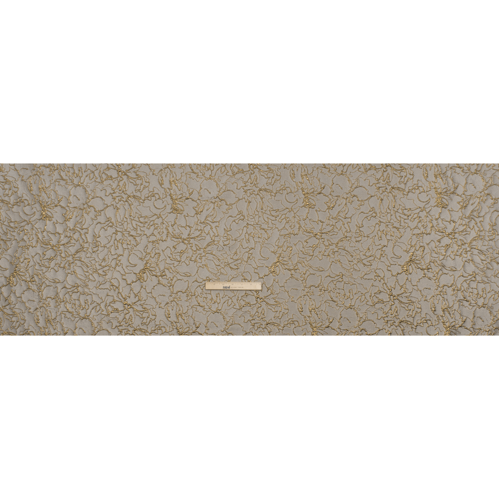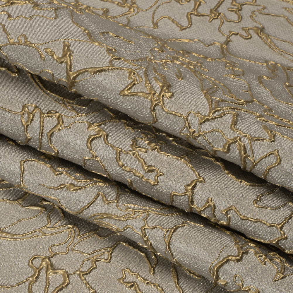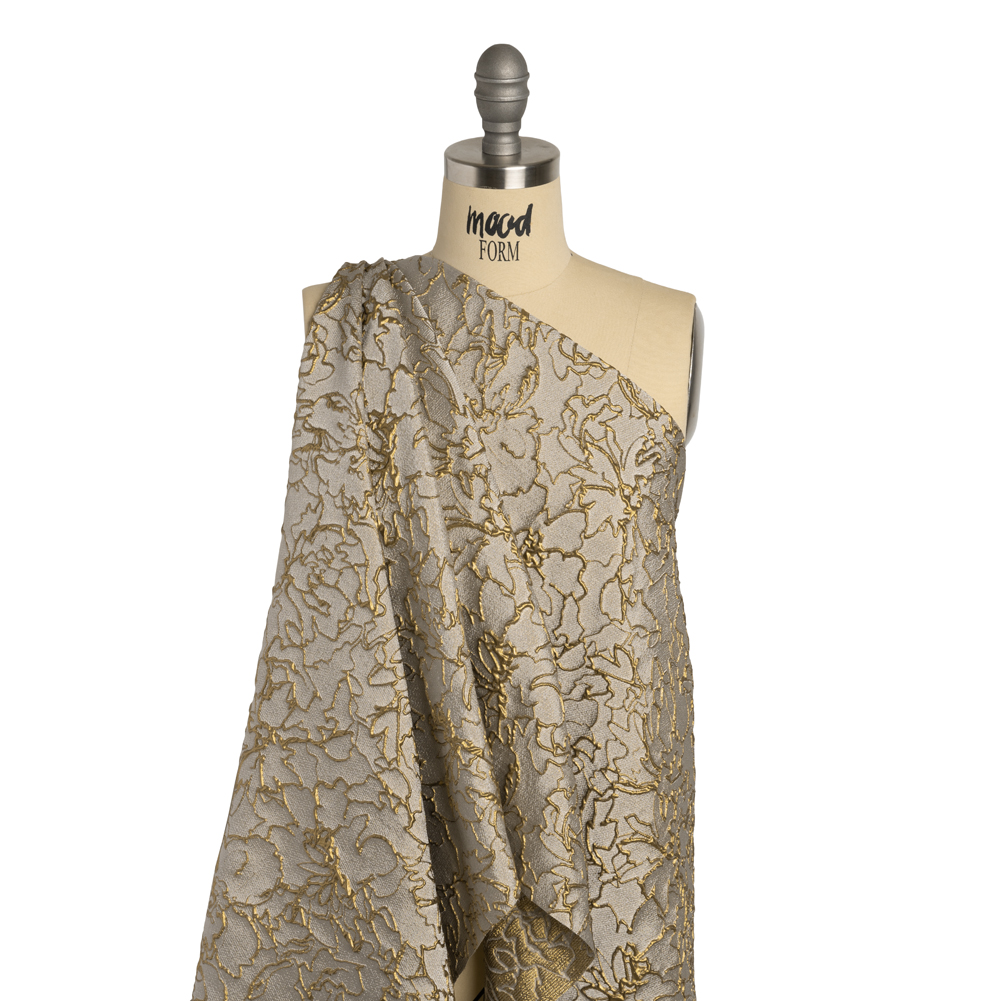 Achieve vintage looks with this Gray and Gold Floral Outlines Metallic Luxury Brocade. With a tactile hand and semi-structured drape, it’s the ideal choice for stunning eveningwear.Suggested Projects: Gowns, Skirts, JacketsContent: 48% Rayon, 29% Polyester, 23% LurexStretch: NoneOpacity: TranslucentBe the talk of the social season while draped in this luxury brocade. Embossed floral outlines swirl across the otherwise semi-translucent backdrop, creating a three-dimensional, tactile hand and falling in a semi-structured drape. This fabric is perfect for an evening gown or skirt, or for a Met Gala-esque avant-garde look. As this fabric is translucent, we recommend use with a lining, or over camis or slips.