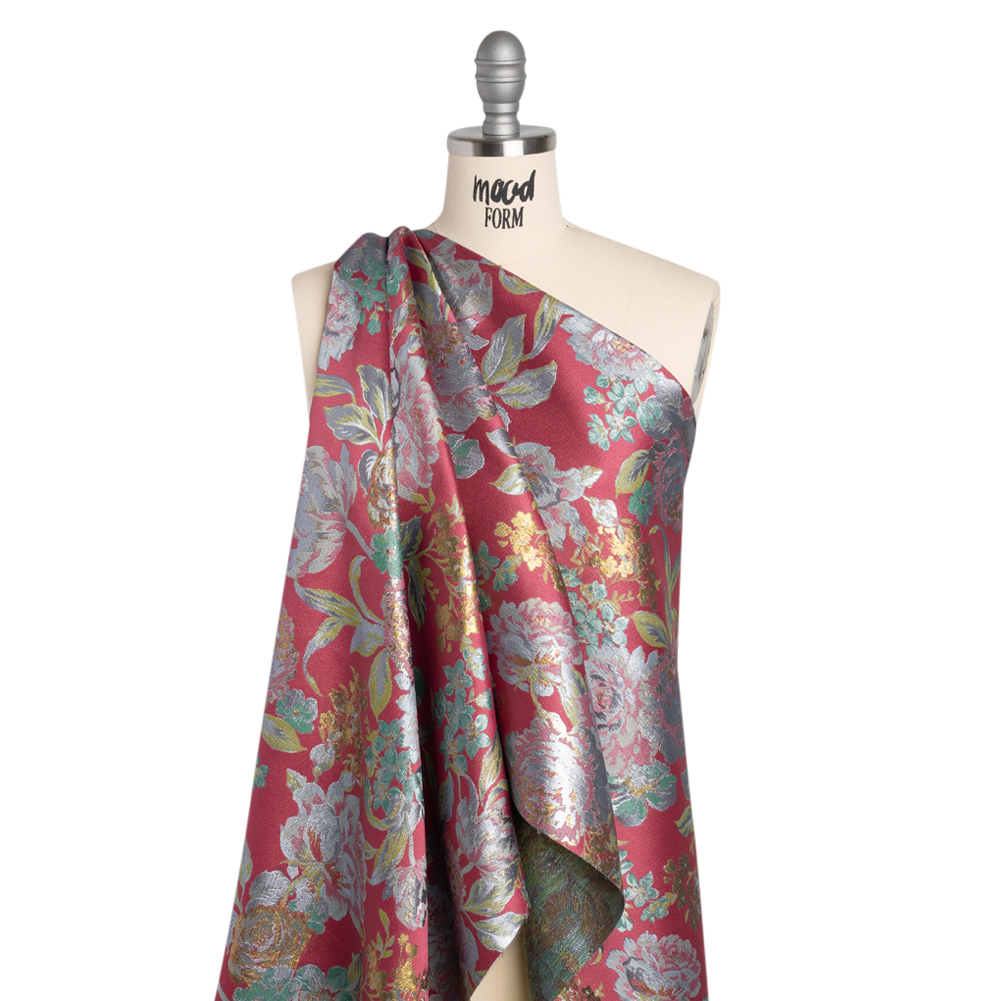 Craft a candy-colored wonderland with this Pink, Silver and Green Classic Flowers Metallic Luxury Brocade—featuring a tactile hand and semi-structured, voluminous drape.Suggested Projects: Dresses, Skirts, Jackets, VestsContent: 85% Polyester, 15% LurexStretch: NoneOpacity: OpaqueMetallic silver, green, and gold carnations bloom against a magenta pink background—a luxurious design truly fit for royals. Craft tailored eveningwear using its tactile, slightly grainy hand. Semi-structured and voluminous, the drape lends itself wonderfully to stunning ball gowns, circle skirts, structured jackets, and spiffy vests. For extra luxury, we suggest lining this fabric.