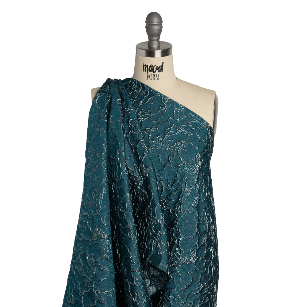S-teal the show in this Teal and Sky Blue Floral Outlines Metallic Luxury Brocade. With a tactile hand and semi-structured drape, it’s the ideal choice for stunning eveningwear.Suggested Projects: Gowns, Skirts, JacketsContent: 48% Rayon, 29% Polyester, 23% LurexStretch: NoneOpacity: TranslucentBe the talk of the social season while draped in this luxury brocade. Embossed floral outlines swirl across the otherwise semi-translucent backdrop, creating a three-dimensional, tactile hand and falling in a semi-structured drape. This fabric is perfect for an evening gown or skirt, or for a Met Gala-esque avant-garde look. As this fabric is translucent, we recommend use with a lining, or over camis or slips.