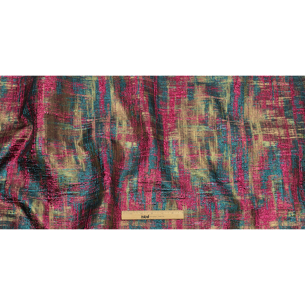 The essence of a harmonious rose garden appears in an abstract form within this Metallic Magenta, Forest, and Olive Distressed Plaid Luxury Brocade. With a crisp, crinkled hand, the vivid face features a plaid-like pattern in metallic forest green, olive, and magenta. With a malleable, yet somewhat structured drape, craft some vivid dresses, skirts, ball gowns, and evening shawls! Slightly translucent, insert a lining for full opacity and comfort in wear.