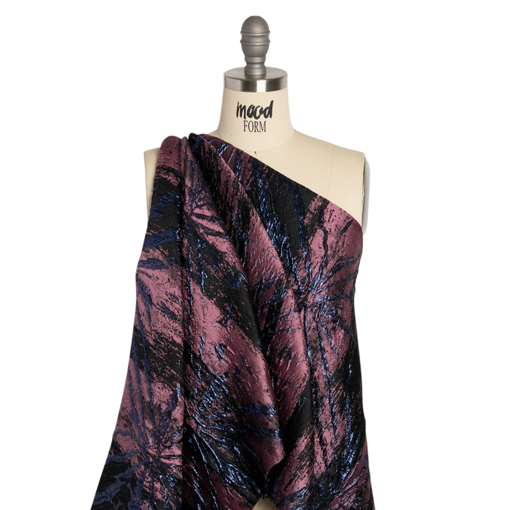 This beautiful Metallic Midnight, Dark Mauve and Black Exploding Flowers and Brushstrokes Luxury Brocade will have you twirling in luxury from dusk 'till dawn. As night falls like paintbrush strokes over a dusty purple sky, navy flowers burst like fireworks. Their metallic shine isn’t the only thing that makes these flowers pop—the complex weave raises these flowers, along with ripples in the face, to give them an embossed look and add texture to the slick hand.Evoking a sense of luxury due to its dimensional face, subtle luster, and voluminous drape, this fabric is stunning in elegant garments and special-occasion formal wear. Punctuate your evening with bold gowns, unique circle skirts, exciting corsets, structured jackets, and more. Plus, you can increase comfort and luxury with the addition of a silk habotai lining!