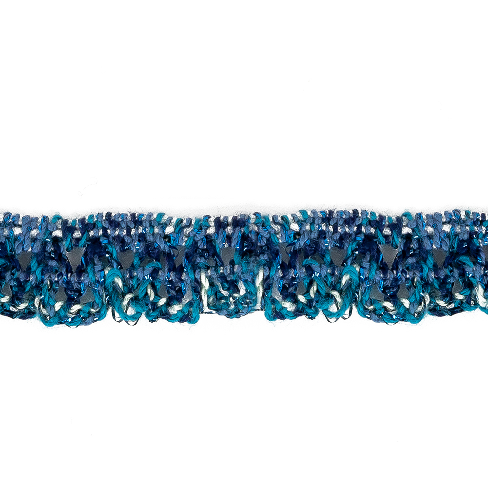 Keep things fresh around the house with this Metallic Moody Blue, Saxony Blue and Ambrosia Fine Crocheted Trim. Slightly reminiscent of curtains or drapery, it is an amalgamation of cool colors woven together. Measuring in at 0.5", use it to adorn upholstery and home decor projects, or to decorate the hems of garments!