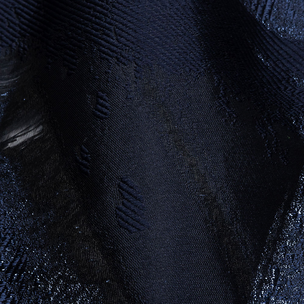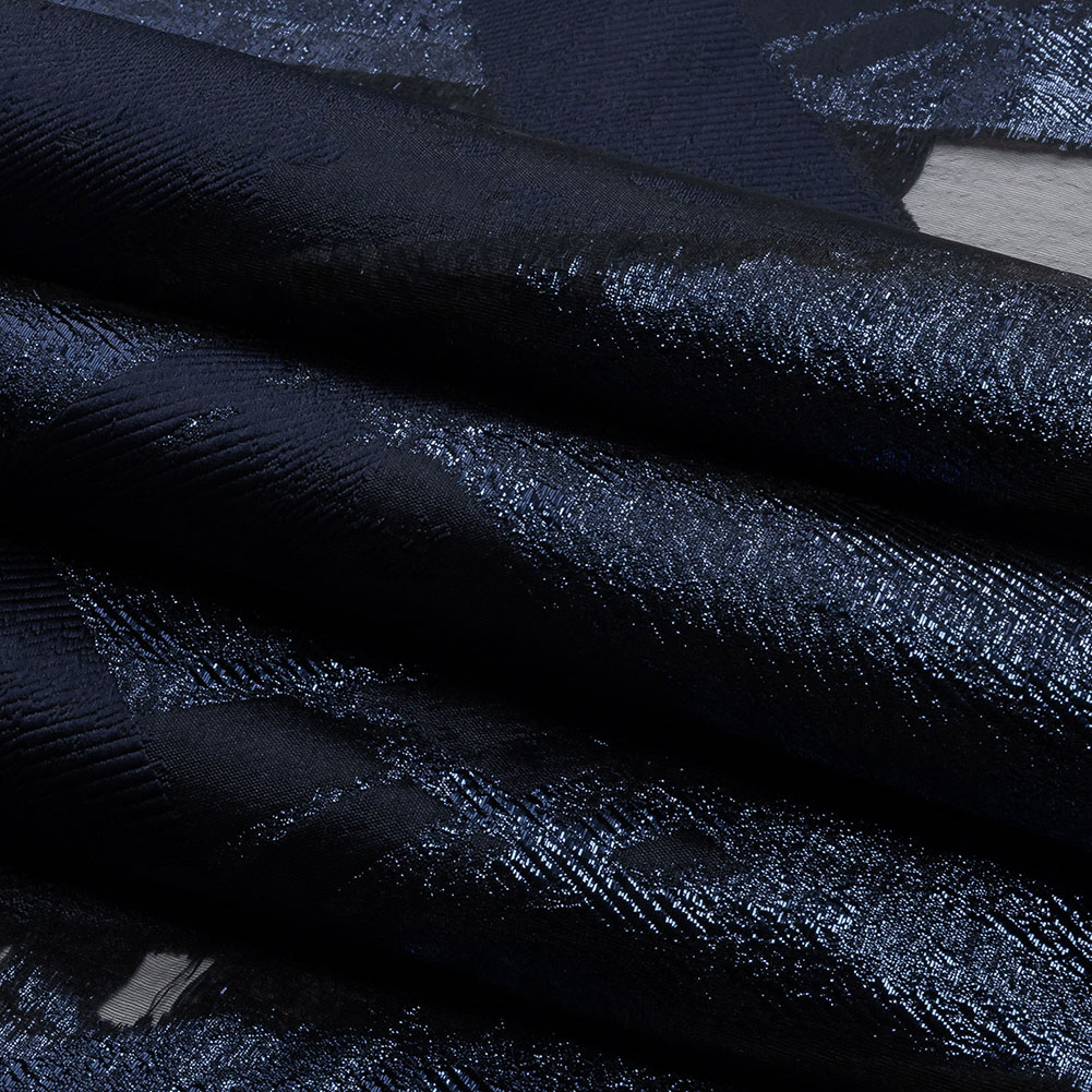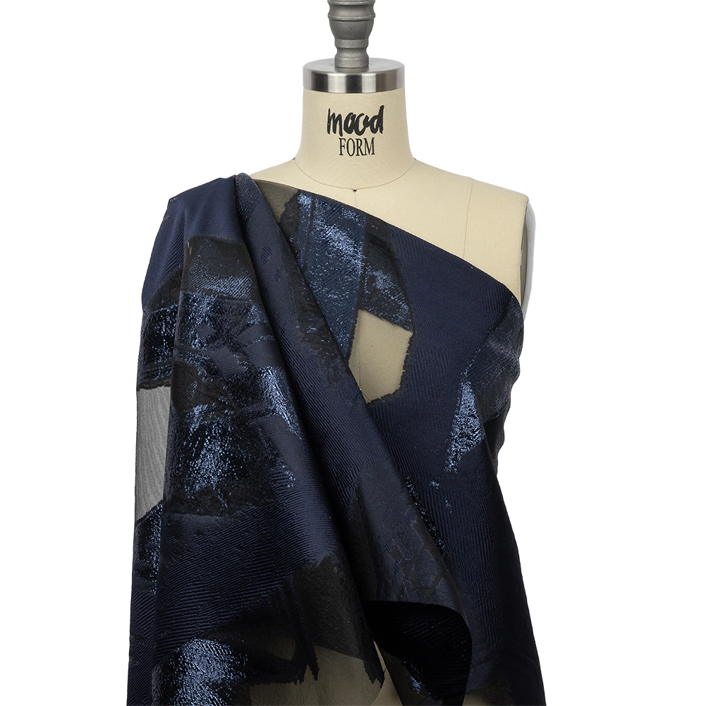 Take a midnight stroll in this Metallic Navy Painterly Geometrics Luxury Burnout Brocade! Brushstrokes and hard shapes come together with metallic threads and sheer burnout sections to form an infinitely intriguing material. With a crisp, softly textured hand, it offers a malleable yet structured drape. Enhance your artistic palette by creating a fanciful gown, dress, or skirt! Without stretch and slightly translucent, we recommend adding a lining for full opacity and overall comfort.