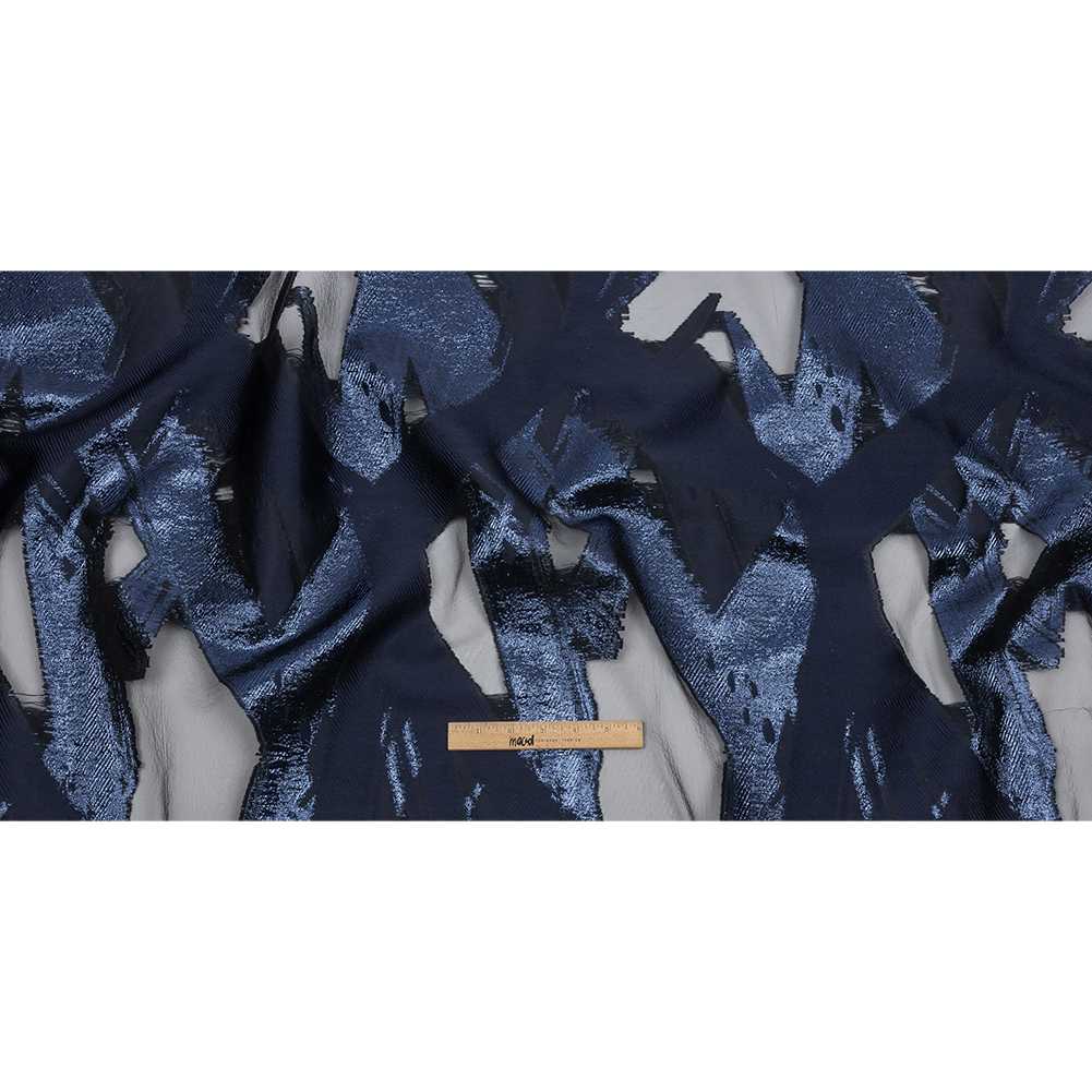 Take a midnight stroll in this Metallic Navy Painterly Geometrics Luxury Burnout Brocade! Brushstrokes and hard shapes come together with metallic threads and sheer burnout sections to form an infinitely intriguing material.