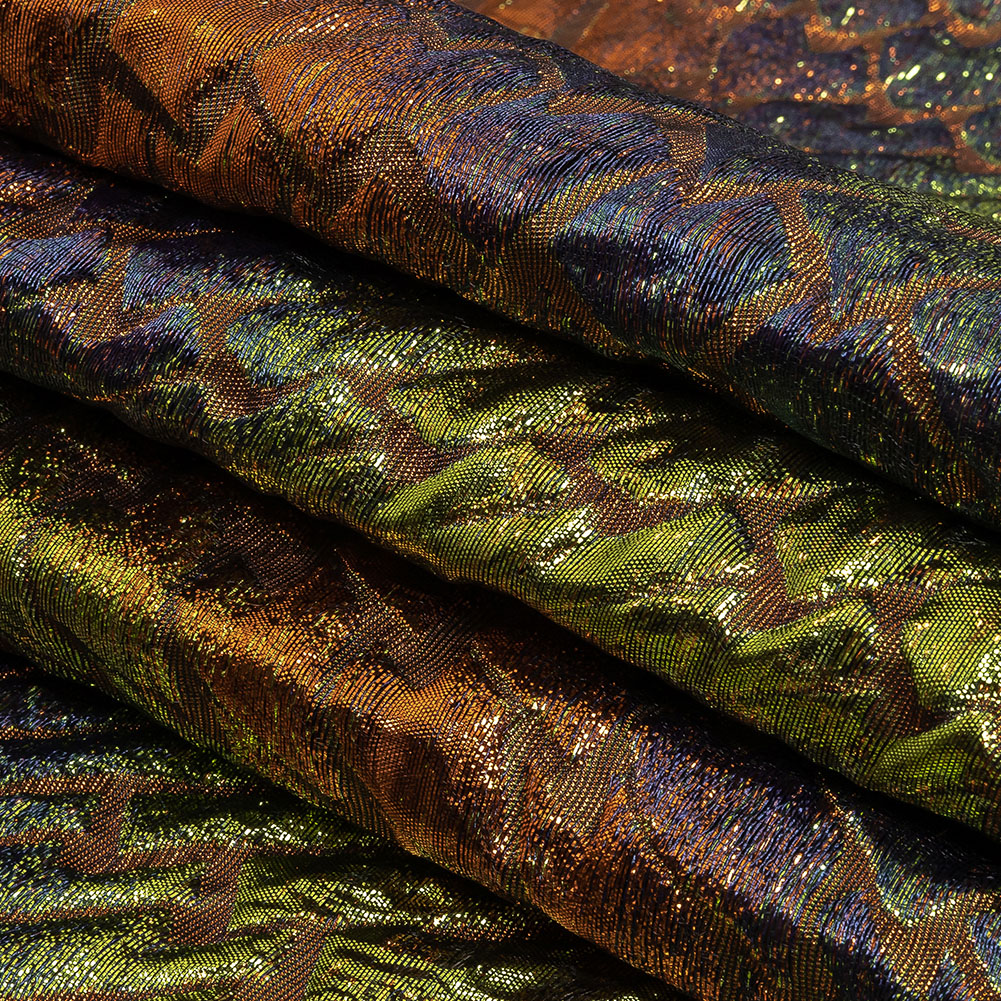 In a completely unique colorway, you'll effortlessly pull focus in our Metallic Orange, Lime and Navy Abstract Mosaic Luxury Brocade! A scale-like mosaic design bursts over the face of this fabric, swirling in an organic design and shining in shades of orange, lime, and navy. Run your hands over the puckered, dynamically textured face, and be inspired to create with the semi-structured, pliable drape. We suggest evening gowns and structured skirts or bomber jackets and trousers. Translucent, a lining may be desired to add extra modesty and prevent the brocade fibers from fraying at the seams.