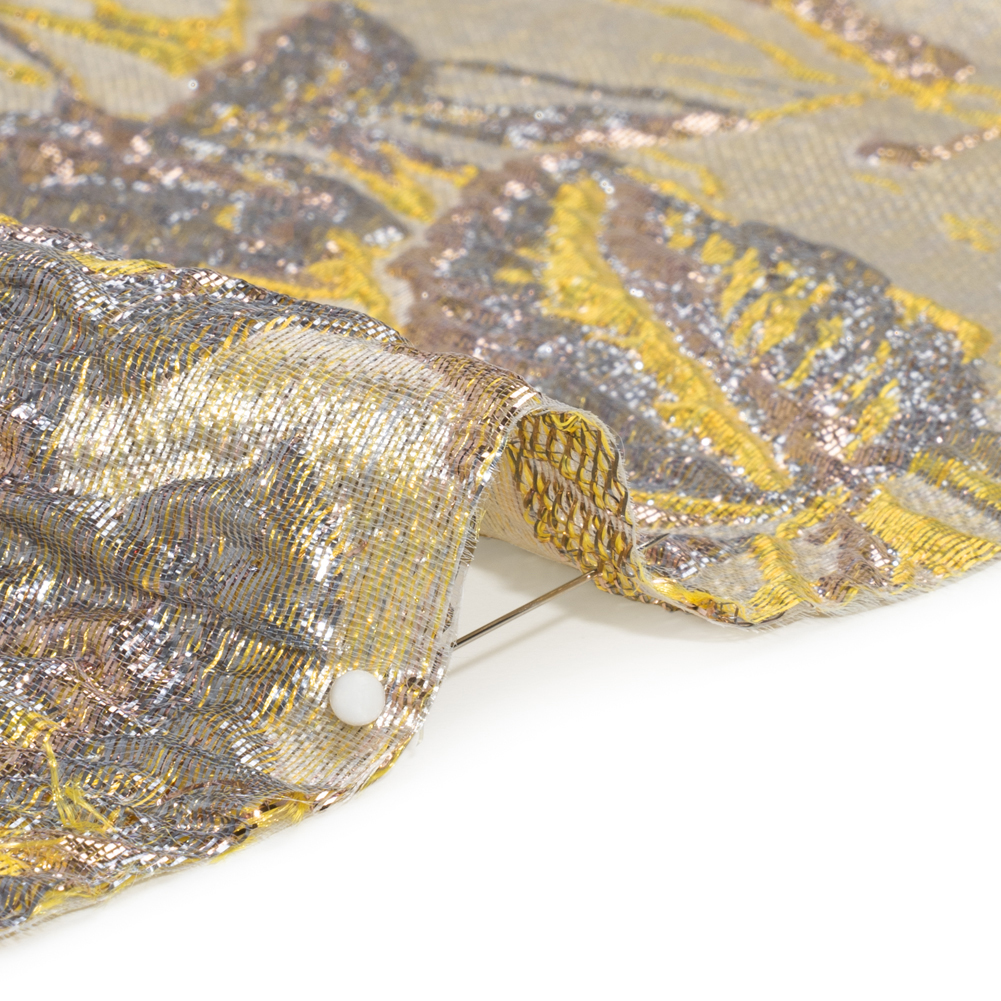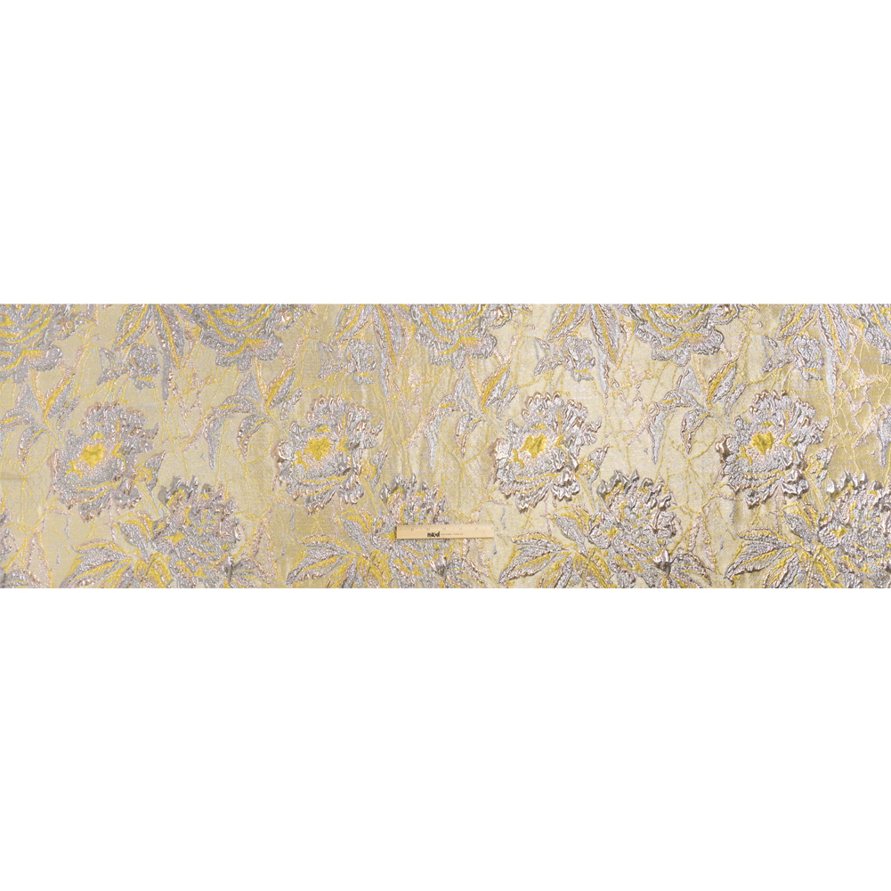 Radiate elegance with this Metallic Pale Blue, Yellow and Rose Gold Radiant Roses Luxury Brocade! Silver, rose gold, and mustard yellow flowers spread their metallic petals against a crackled, lustrous background. The weave raises the flowers and cracks, bringing a spongy feeling to the sleek and grainy face. Surprisingly supple, this luxurious fabric dreams of voluminous ball gowns, jackets, bodices, and more. Slightly translucent; a silk habotai lining can be added for increased comfort and luxury.