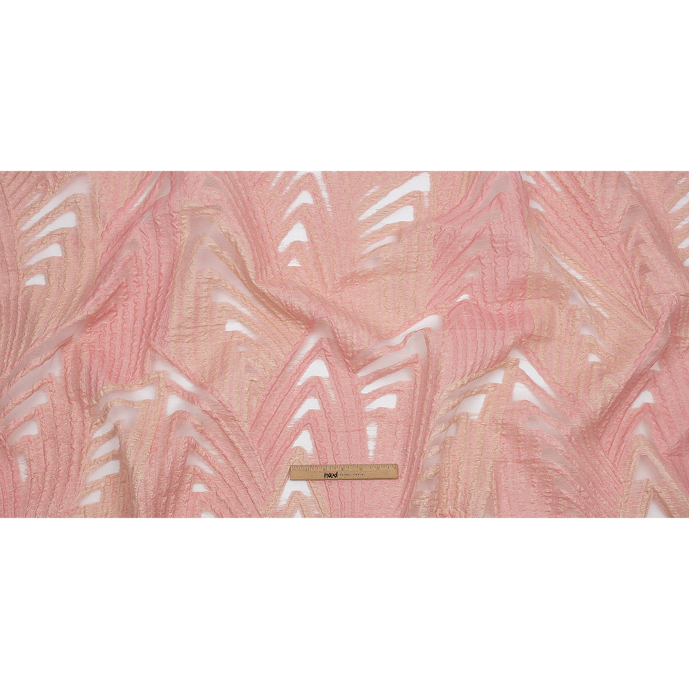 Spring is calling from the sweet coloration of this Metallic Pink and Peach Overlapped Nested Triangles Luxury Burnout Brocade. Nested triangles overlap in a feather-like fashion, accented by burnout sections for a touch of sheer luxury. With a shimmering metallic finish, the fabric offers a crisp, bumpy hand. Use its light but voluminous drape to make gowns, bell dresses, sarees, shawls, blazers, vests, and so much more! Transparent in part, a lining can be used for full opacity, or insert a lining of a contrasting color for a unique pop!