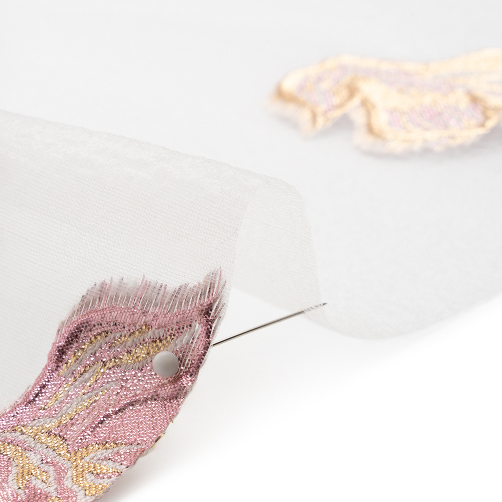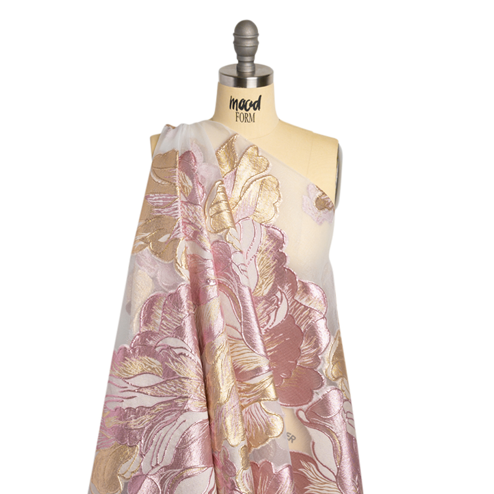 Romance is woven into this stunning Metallic Pink, Gold and White Floral Luxury Burnout Brocade Panel. The magnificence of the pink and gold metallic threading matches the sheer magnitude of the flowers, displayed on a breathtaking panel measuring 61” by 62”. The feel of the flowers is sleek, grainy, and three-dimensional as they rise slightly from the puckered white mesh. Either as an overlay or paired with a silk habotai lining, this semi-structured fabric conjures up dream-like ball gowns, voluminous circle skirts, and more.