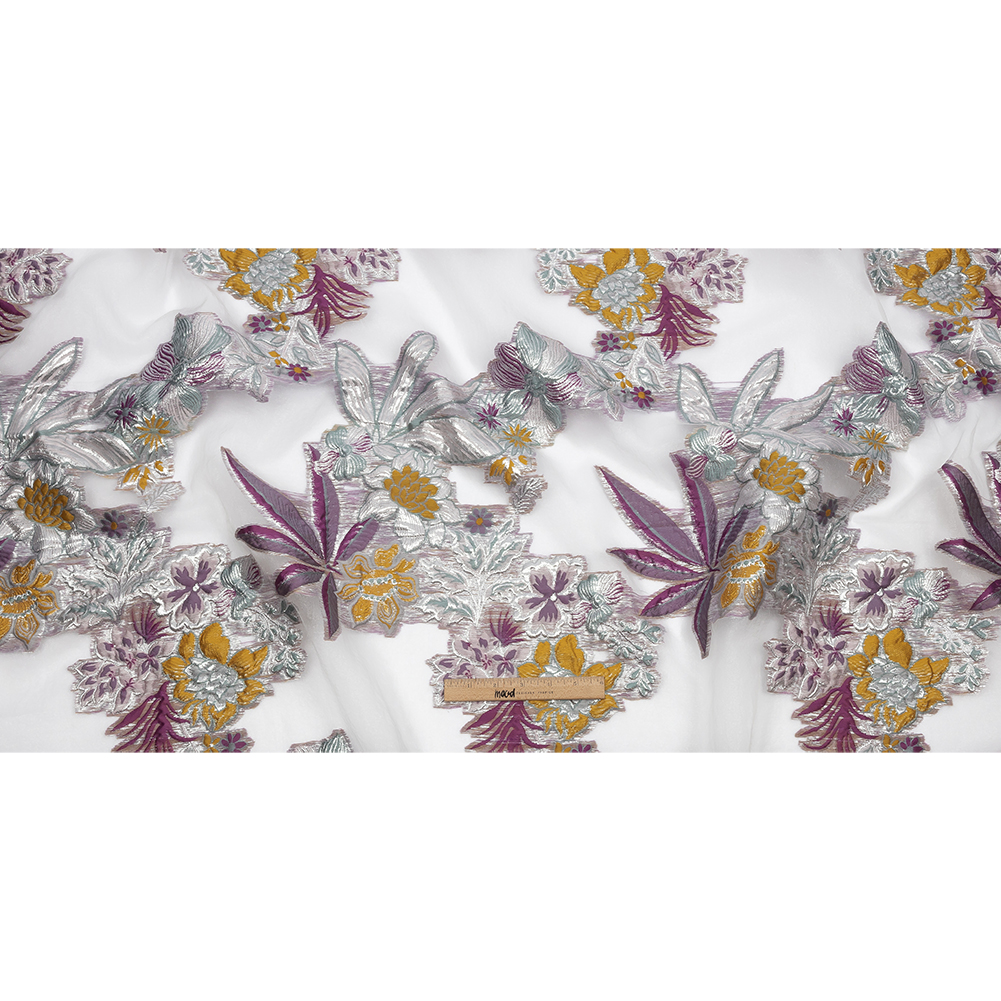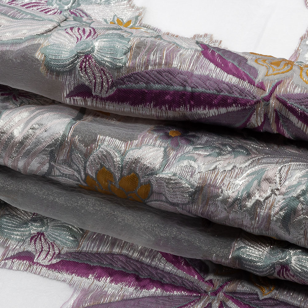 Lush gardens live on the surface of this Metallic Plum, Gray Green, and Goldenrod Floral Luxury Burnout Brocade. Plum purple, sage green, and silver flowers and leaves spread in opaque lushness over a white ground, with the burnout pattern leaving the background entirely sheer. A crisp and slightly bubbly feel adds an extra layer of luxury. Use its flexible, voluminous drape to make gowns, bell dresses, sarees, evening dresses, costumes, trousers, jackets, suits, opera coats, and so much more! Transparent in part, a lining can be used for more opacity if desired.