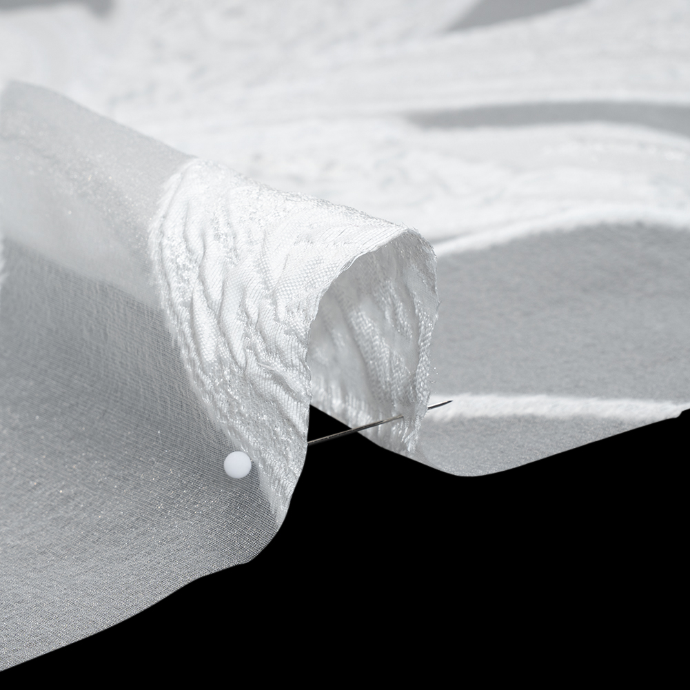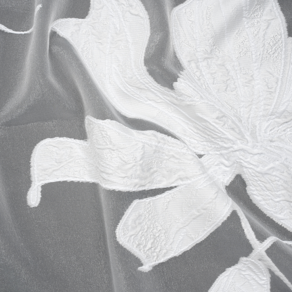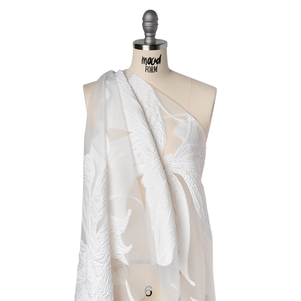 Show-stopping special occasion-wear will bloom from this White Big Flowers Metallic Polyester and Rayon Burnout Brocade—featuring a sleek hand and billowing drape.Suggested Projects: Gowns, Wedding Dresses, Skirts, JacketsContent: 55% Polyester, 30% Rayon, 15% LurexStretch: NoneOpacity: SheerOpulence unfurls in this burnout brocade, where grand blossoms stretch skyward in rippled, tactile relief against a sheer ground. The intricate weave lifts each flower with dimensional depth, their opacity striking against the transparency beneath. Boasting a sleek hand and billowing drape, it’s destined for ball gowns, wedding dresses, dramatic circle skirts, and beyond—limited only by your imagination. As the fabric is sheer, pair it with a sumptuous lining for a refined, luxurious finish.
