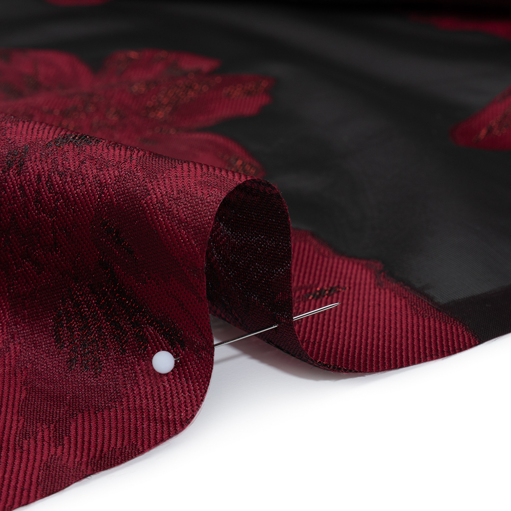 Metallic Polyester Burnout Brocade - Deep Red and Black Floral - Designer Deadstock