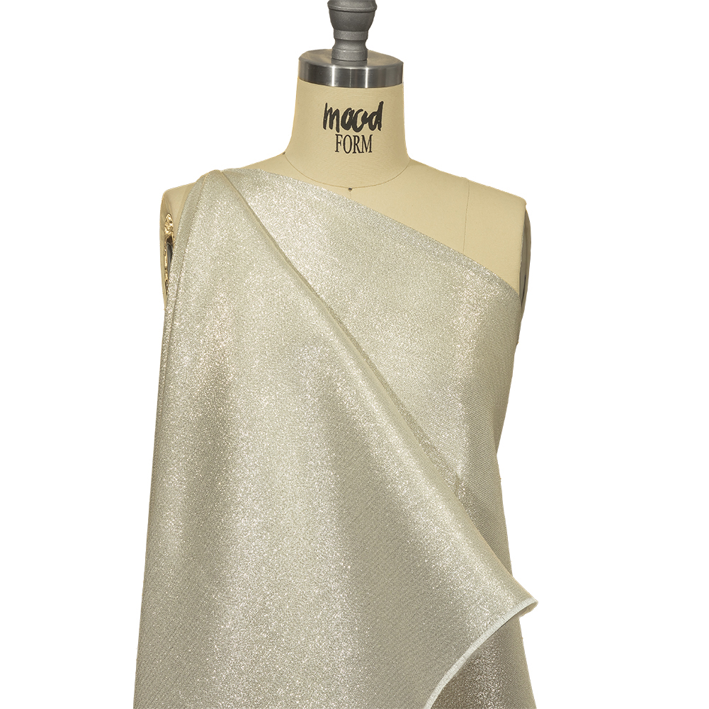 Between glamorous and ethereal, there you'll find this Glimmer White and Silver Metallic Polyester Lame! On a smooth white backing, silver threads glimmer and dance in the light. Flexible and malleable, make corset tops, enviable eveningwear, or relaxed blazers and trousers. Opaque, add a lining for structure where desired.