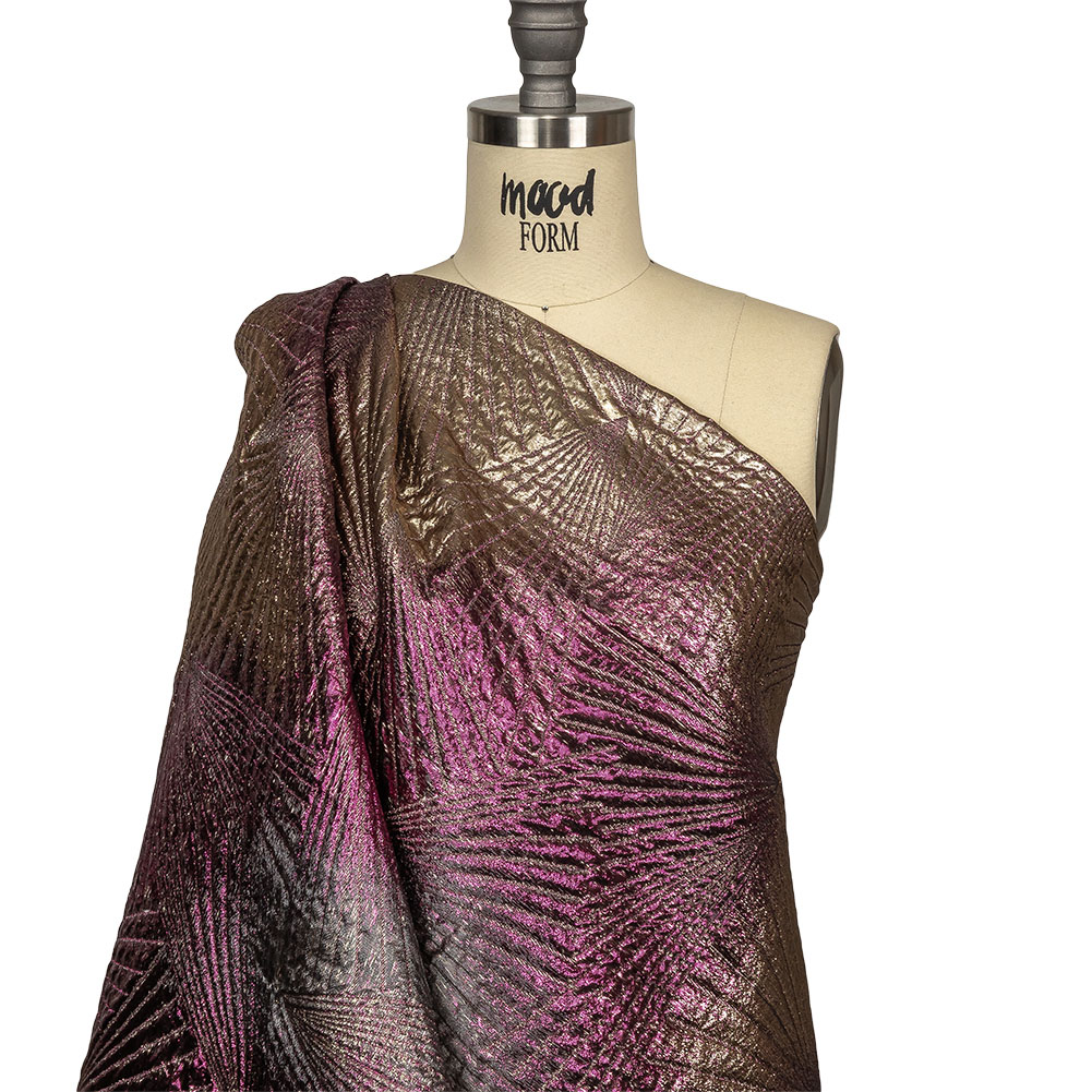 Wow any audience in our show-stopping Metallic Purple, Gold and Gray Fanning Rays Luxury Brocade! Purple, gunmetal gray, and gold mix over intersecting, textural rays, with an allover sparkle providing blinding beauty. Pliable and semi-structured in drape, boxy moto jackets, blazers, and trousers are just as feasible as gowns and skirts, perfect for an evening soiree. Translucent, a lining can add additional modesty if desired and ensures finished edges without fraying as well as added comfortability.