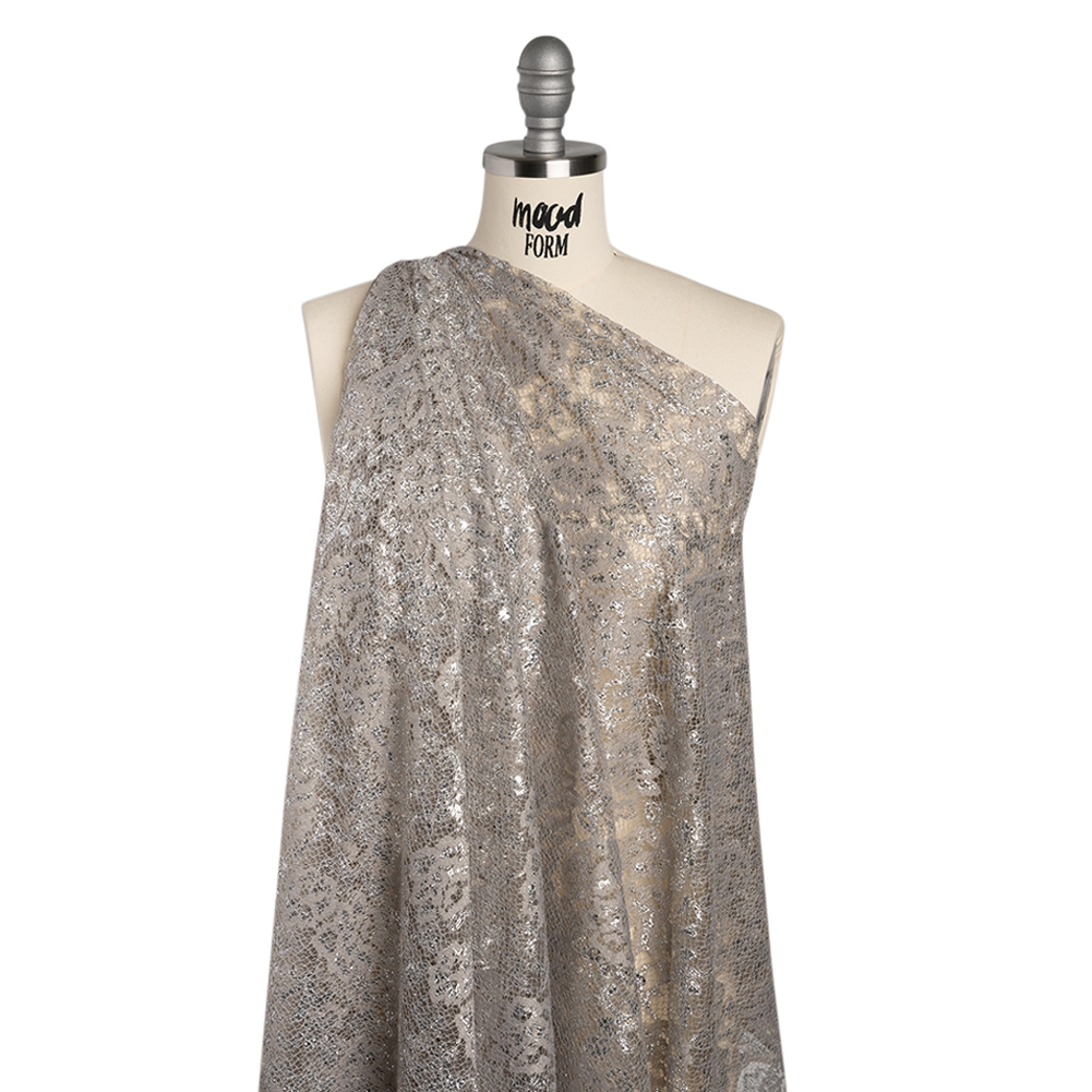 Set your design plans in stone with this Metallic Flowers and Leaves Raschel Lace with Finished Edges—featuring a soft, slightly tactile hand and slightly structured drape.Suggested Projects: Skirts, Shirts, Dresses, JacketsContent: 76% Nylon, 24% LurexStretch: NoneOpacity: SheerFlowers and leaves bloom and climb across this sandstone gray raschel lace panel, with a sprinkling of silver metallic threads adding an elegant gleam. A slightly structured drape and soft, slightly tactile hand makes it ideal for airy silhouettes and structured evening wear—with a scalloped, finished edge making completing your projects that much easier. With its delicate design, we envision waterfall skirts, breezy button-up shirts, overlays for flowing evening gowns and structured jackets, lingerie, and more! Sheer, due to the lace weave, use it as a panel or insert a lining for more opacity.
