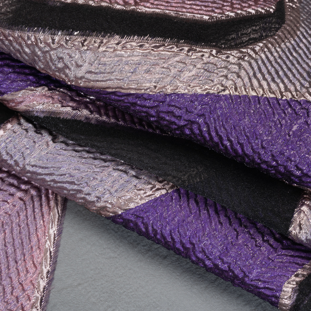 Follow the lead of your intuition and stitch show-stopping designs out of this Orchid Soft Geometric Abstract Metallic Rayon and Polyester Burnout Brocade—featuring a sleek hand and slightly structured drape.Suggested Projects: Gowns, Skirts, JacketsContent: 70% Rayon, 19% Polyester, 11% LurexStretch: NoneOpacity: SheerAn abstract geometric design sweeps across this brocade in orchid, deep purple, and rose gold, its brilliance broken by sheer black burnout sections that add striking contrast. With a sleek, luxuriously tactile hand and a gently structured drape, it transforms any look into red-carpet glamour. Imagine radiant evening gowns, voluminous hoop skirts, or sharply tailored jackets—each creation destined for the best-dressed list. Because of its sheer burnout areas, a lining or artful draping is recommended for a refined, peekaboo finish.
